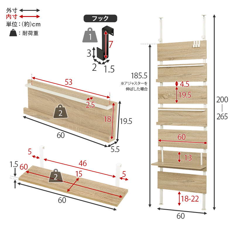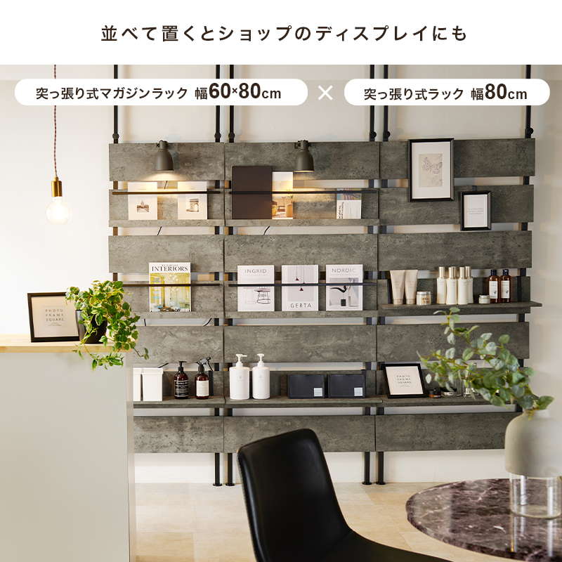 ■商品説明●本の表紙をディスプレイできるマガジンラック付きの突っ張り式収納です。●お気に入りを飾ってお部屋をセンスアップ。●突っ張るだけで垢抜けた雰囲気を演出します。●スリムなので圧迫感が無く、お部屋が狭くてもおしゃれなインテリアが叶います。●壁に穴を開けずに設置が可能なので、賃貸や狭いお部屋、店舗などにもおすすめです。●壁面収納としてはもちろん、お部屋の間仕切りやショップのディスプレイにも最適です。●並べて設置することでカタログや商品を合わせてディスプレイすることができます。●マガジンラック×2枚、棚板×1枚、S字フック×3個で「立てる」「吊るす」「置く」に対応します。■商品詳細カラー:ブラウン/ブラック、グレー/ブラック、ナチュラル/ホワイトサイズ(約):幅60×奥行21.5×高さ200〜265cm素材:フレーム:スチール、棚板:プリント紙化粧繊維組立:お客様組み立て式