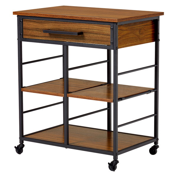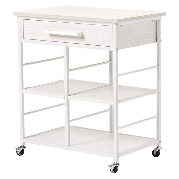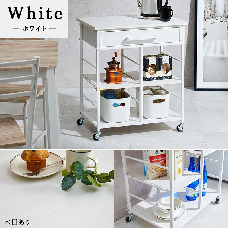 ■商品説明●追加の作業スペースや補助テーブルとして快適な広さ。●キッチンの補助テーブル、キッチンラック、家電ラック、収納棚としてもおすすめです。●使い勝手が良く、作業するのに丁度いい高さ70cm。●天板や棚板は全てメラミンシートを貼り耐水性・耐熱性が高く、傷づきにくくなっています。●引き出しがついているので、食器や付近などの小物類をまとめて収納することができます。●天板下はオープン棚になっています。高さが調節可能なので収納物に合わせて高さを変更することができます。●フレーム部分には粉体塗装を施しており、水・傷・錆びに強く、マットな質感で上品な仕上がりになっています。●キャスターにはストッパー付き。作業時にはストッパーを掛けることで動くのを防ぐことができます。■商品詳細サイズ(約):幅60×奥行40(取っ手含む42.5)×高さ70cm素材:フレーム:スチール、天板:合成樹脂化粧繊維板(メラミン樹脂)耐荷重:天板部:約10kg、可動棚部:約5kg、固定棚部:約10kg組立:お客様組み立て式備考:キャスター付、可動棚×2枚