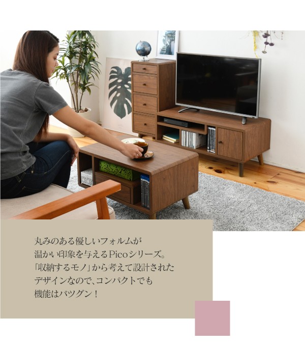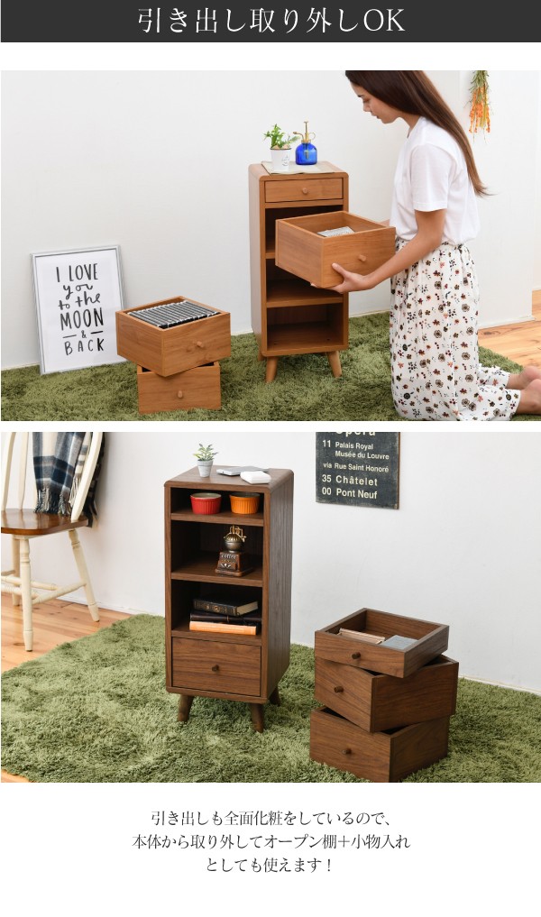 収納するものから設計されたデザインだから、コンパクトでも機能的。一番上の引き出しは印鑑やメモ帳など、3段の引き出しはDVDなども入る深型設計。引き出しを取り外してオープンタイプのラックとして使用することも可能です。丸みのある北欧風のデザインはとてもおしゃれで、コンパクトなのでひとり暮らしのお部屋にもぴったりです。
