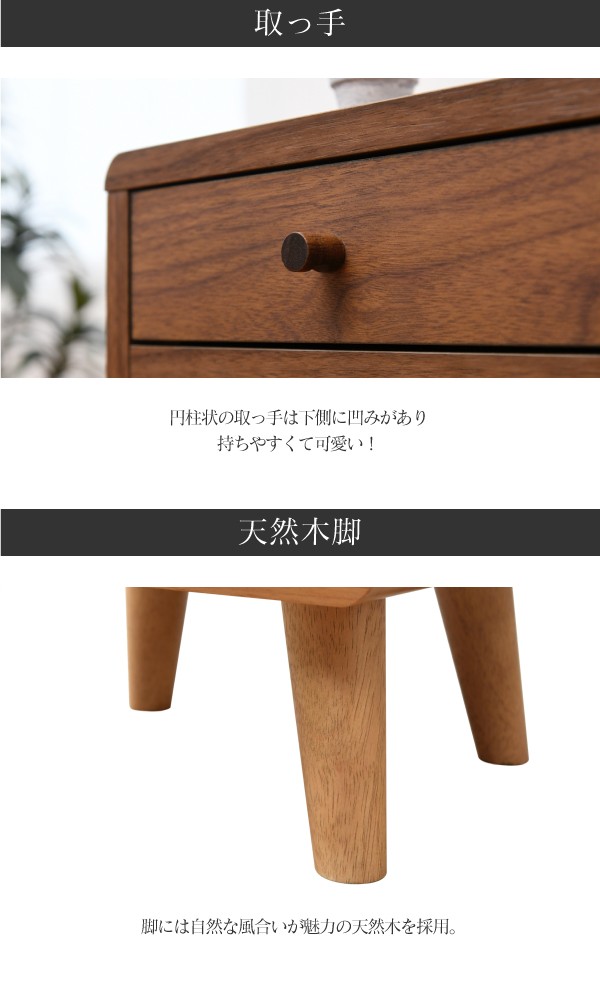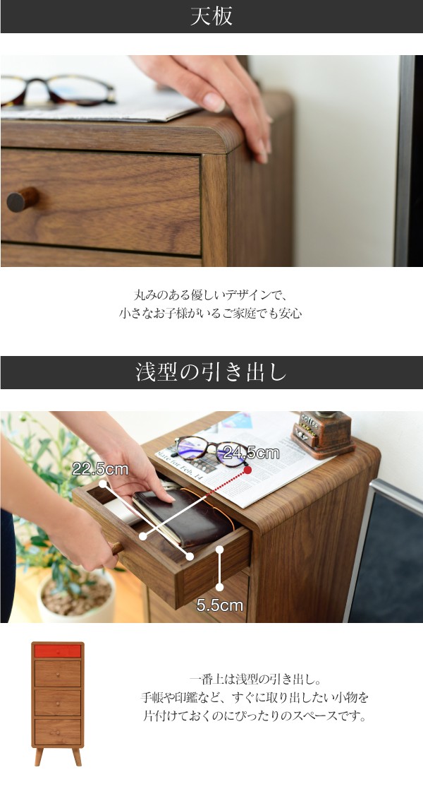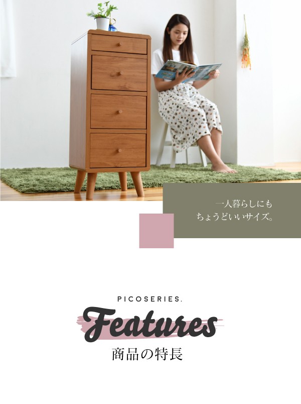 ■本体サイズ[外寸]幅30×奥行32×高さ73.5cm■その他サイズ[内寸] (引き出し1段目)幅22.5×奥行24.5×高さ5.5(有効:6)cm (引き出し2〜4段目)幅22.5×奥行24.5×高さ13.5(有効:14)cm (引き出し無し:1段目)幅26×奥行28×高さ7cm(引き出し無し:2〜4段目)幅26×奥行28×高さ15cm (脚元空間)高さ11cm■材質[本体]プリント紙化粧繊維板 [脚]天然木■収納量・耐荷重[引き出し1段目]約3kg以下 [引き出し2〜4段目]各約5kg以下 [オープン部]各約5kg以下■備考・六角レンチ同梱 ・背面化粧有り・脚は天然木を使用しているため、商品によって色味や木目などの風合いが異なります■生産国マレーシア■組立時間(目安)(大人2人)お客様組立(60分)■送料:全国一律900円(北海道は1200円)※沖縄県・離島は別途送料がかかりますので、事前にお問い合わせ下さい。FAP-0031-BR/FAP-0031-NA スリムチェスト チェスト 4段 スリム 木製 小物入れ 収納 脚付き 北欧こちらの商品は[Picoシリーズ チェスト FAP-0031-BR/FAP-0031-NA]になります。