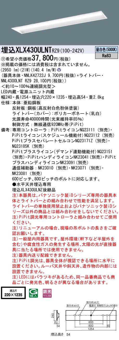 セット品番 XLX430ULNTRZ9セット内訳型番 NNLK42722JJANコード 4549077776426型番 NNL4300LNTRZ9JANコード 4549980375471パナソニック iDシリーズ3200 lmタイプ昼白色埋込穴幅 220 mmPiPit ピピッと 調光タイプ