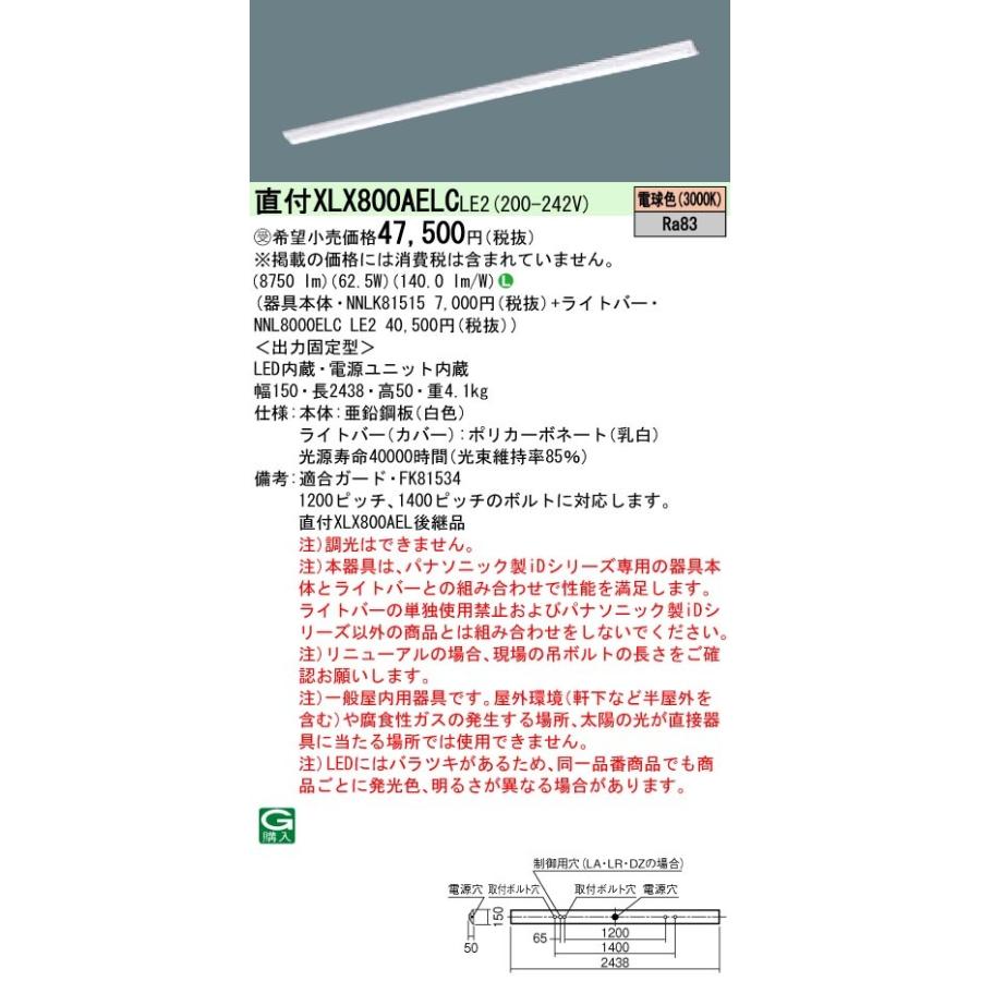 ポイント2倍 パナソニック XLX800AELC LE2 「組合せNNLK81515+NNL8000ELCLE2」一体型LEDベースライト 受注生産品(XLX800AELCLE2) 天井直付型