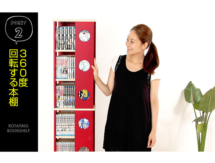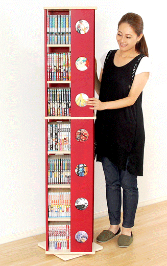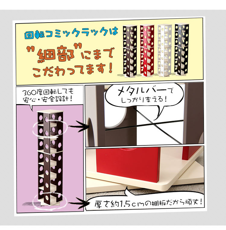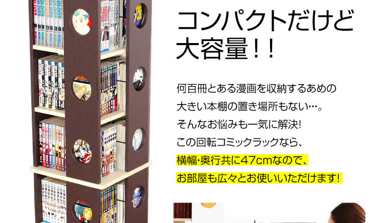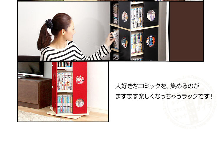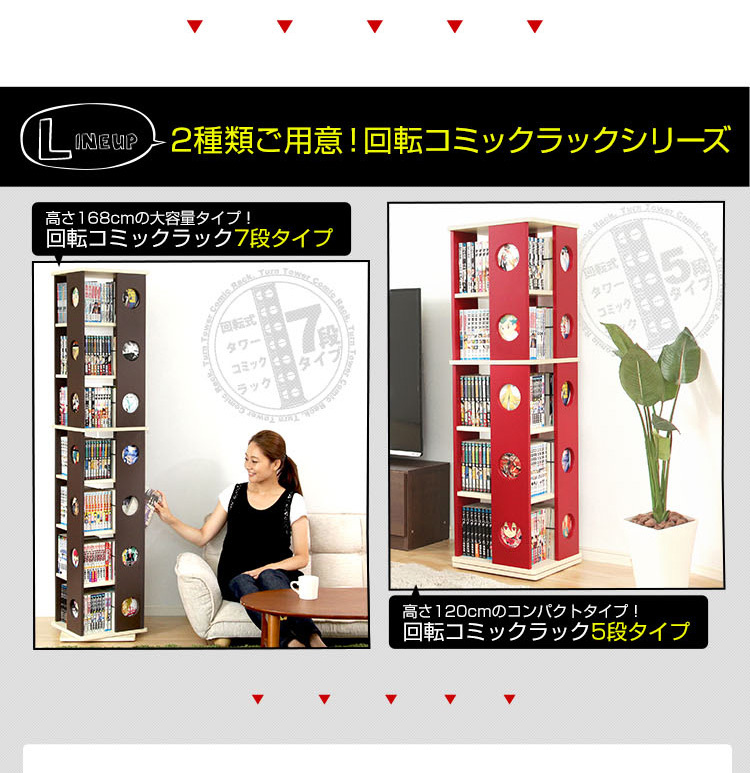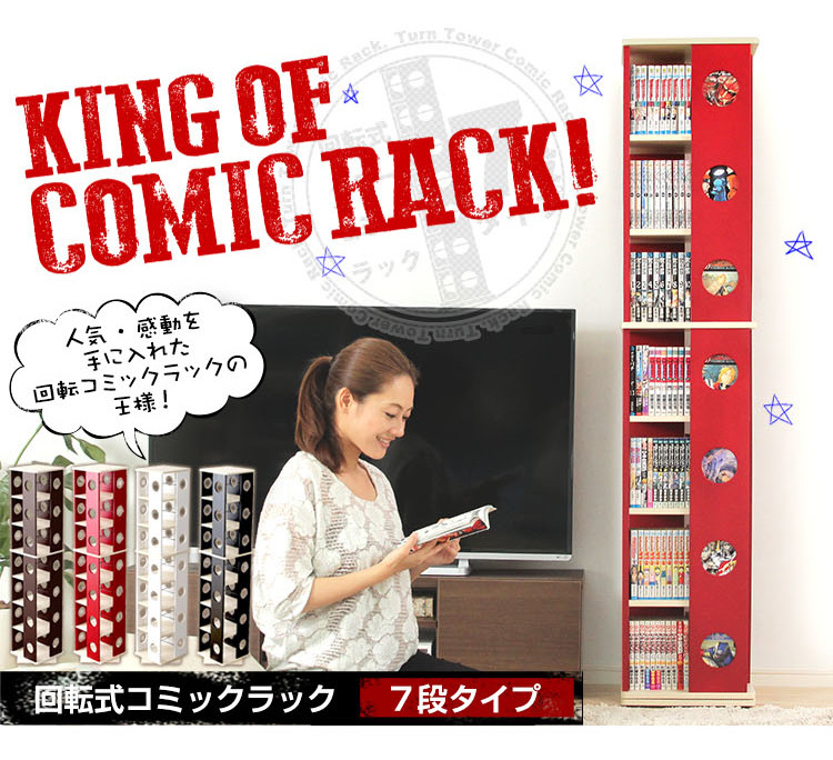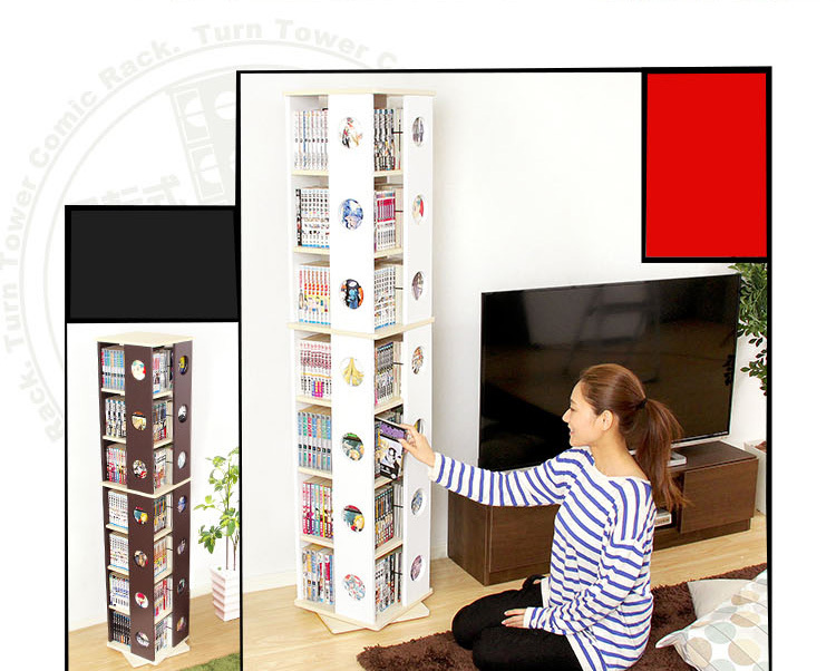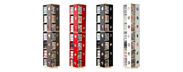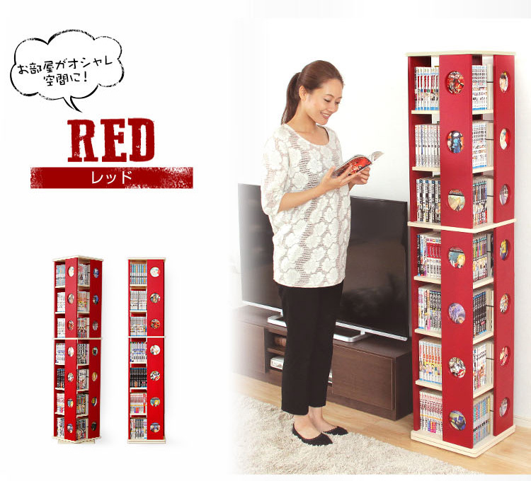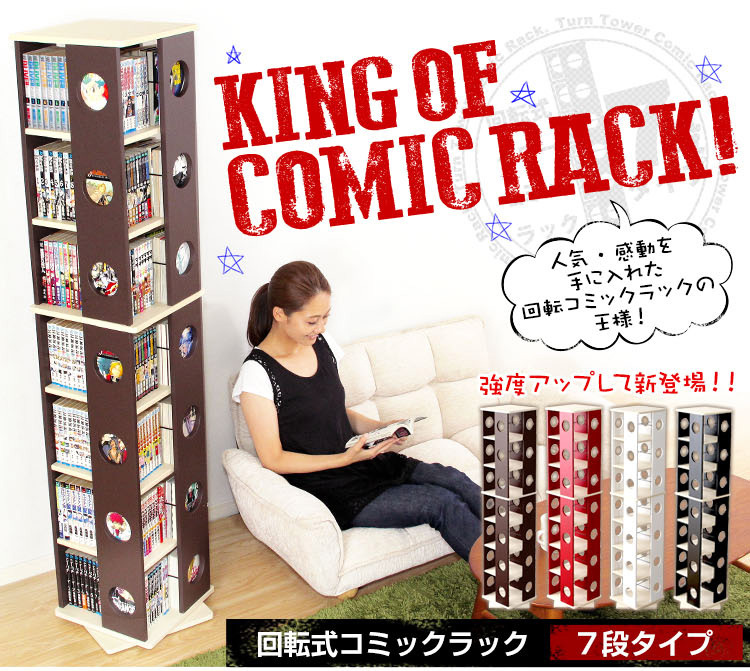 回転式の本棚!回転コミックラック(7段タイプ)【SWK-7】(本棚 回転 コミック)強度アップしたキングオブコミックラック!くるくる回る回転式なので探しやすい!機能性とデザイン性を両立!コミックだけでなく、CD・DVDや雑貨なども収納できます!カラーは選べる4色展開!【商品について】回転式の本棚!回転コミックラック(7段タイプ)【SWK-7】(本棚 回転 コミック)■サイズ:外寸:幅47x奥行47x高さ168cm内寸:(約)幅30x奥行30x高さ22cm(1フロア/4面共通)※商品重量:(約)20kg■カラー:ダークブラウン ホワイト レッド ブラック■素材:構造部材:MDF/ 表面加工:ウレタン樹脂加工■その他:・お客様組立商品です・梱包サイズ(約)97.5x41.5x12.8cm(2.6才)・梱包重量:(約)21kg※耐加重:棚板1枚につき約10kg