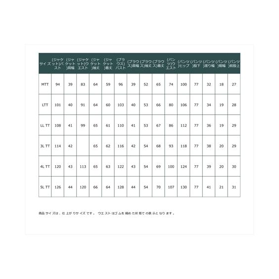 【カラー】ネイビー 【サイズ】MTT/LTT 【備考】※商品サイズは、仕上がりサイズです。※ウエストはゴムを縮めた状態での表示となります。 【素材】品質=[ジャケット]ポリエステル100% [裏地]有(総裏) 前ホック開き 袖口スリット 内ポケット 肩パット付 [ブラウス]ポリエステル100% [裏地]無 後ファスナー[パンツ]ポリエステル100%[裏地]無 ウエスト後ゴム入 前ホック・ファスナー開き内ボタン付 ポケット両脇・後飾りポケット コサージュ付 この商品は3点同サイズのみで販売します。 【原産国】中国製 【メーカー品番】ZZY4322A0025 【コメント】[keyword] レディース ファッション 女性 大きいサイズ ぽっちゃり ふくよか プラスサイズ ラージ トールサイズ 背が高い 高身長 ゆったり ▼ネイビー