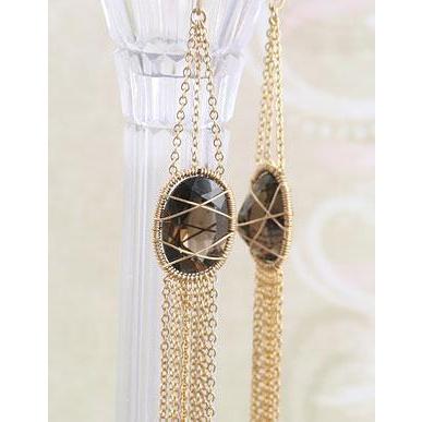 高級感のある大粒のオーバル型のスモーキークオーツのルース(裸石)をワイヤーラッピングでフレーミングした大人っぽいピアス。垂れ下がったチェーンがシャラシャラと繊細な動きをみせます。カジュアルにもエレガントにも使えるお洒落なピアスです。 ピアス金具:K14GF(K14ゴールドフィルド)モチーフ:K14GF(K14ゴールドフィルド)縦(約)100mm、横(約)13mm前後フックを含む全体の長さ:約113mm使用天然石:スモーキークオーツ ルース オーバル 縦(約)14mmx横(約)10mm"} <ご注文前にご一読下さい>