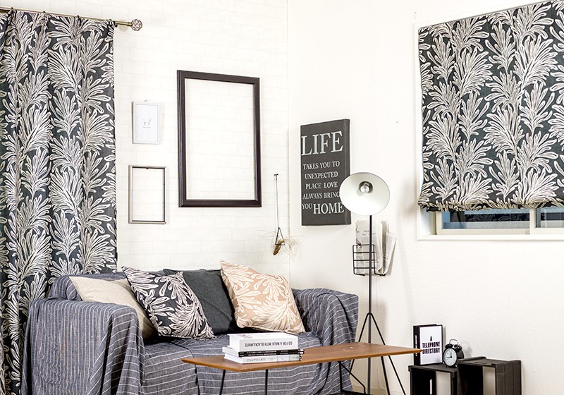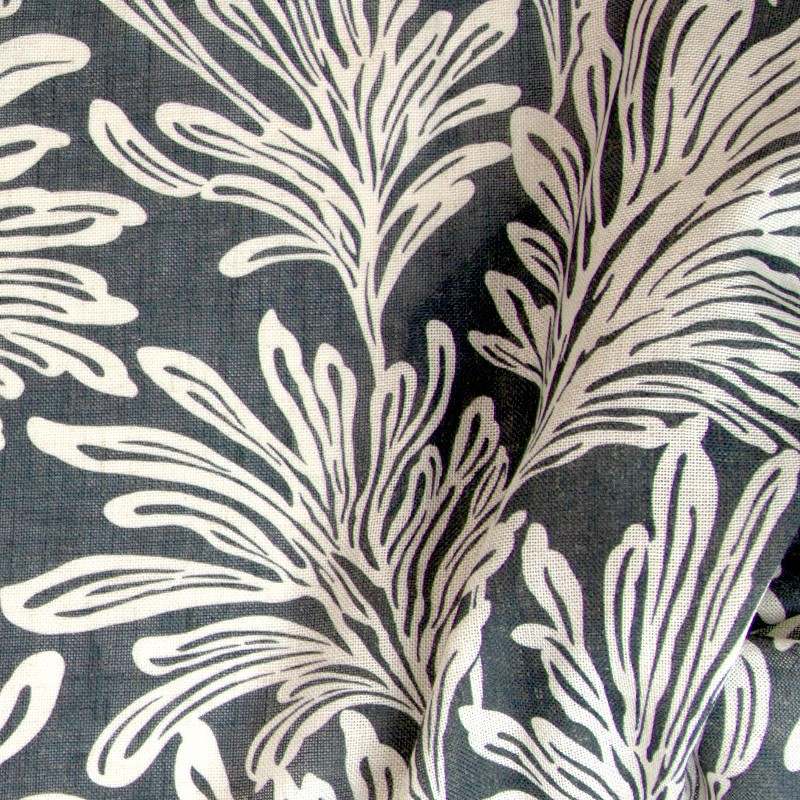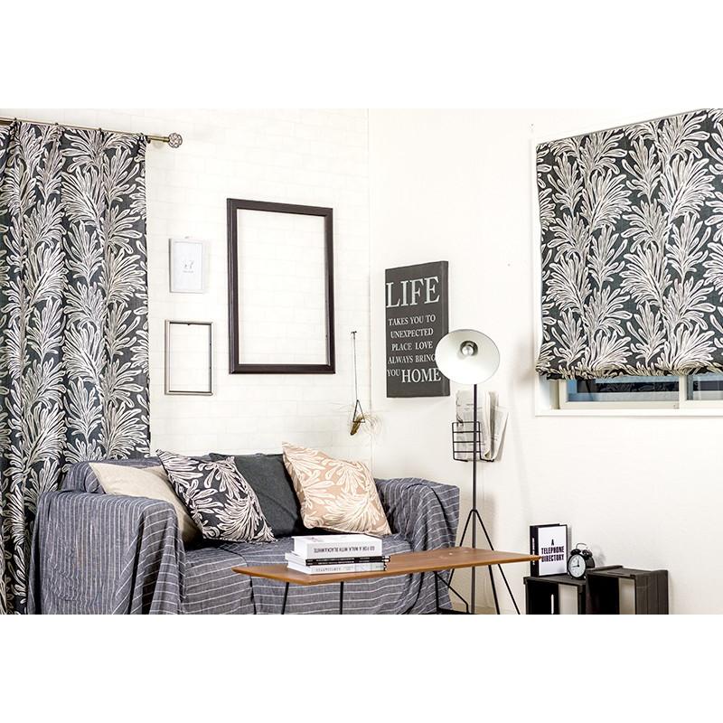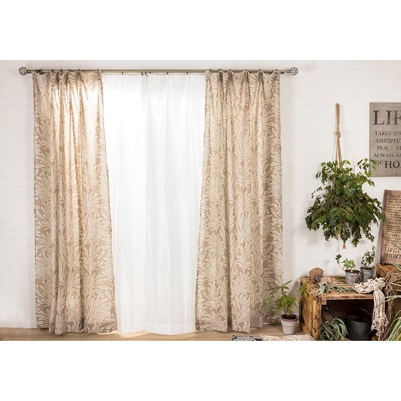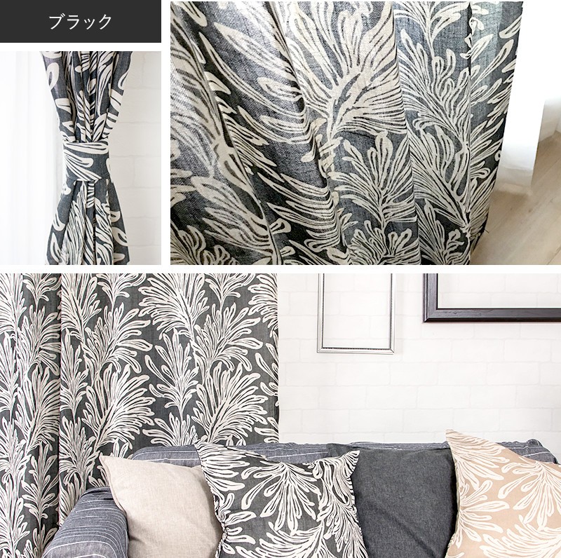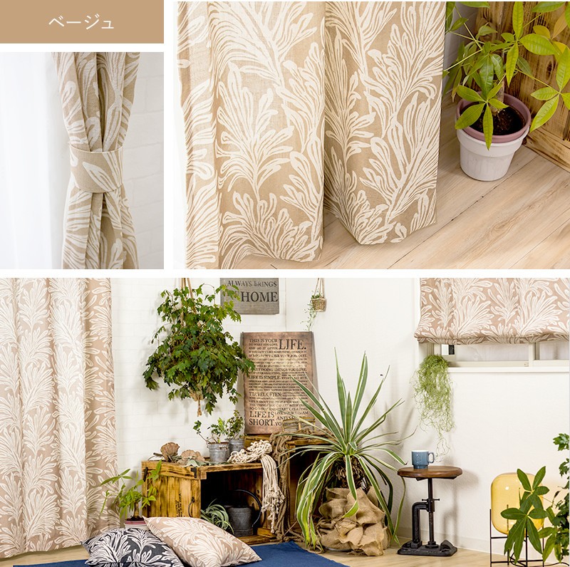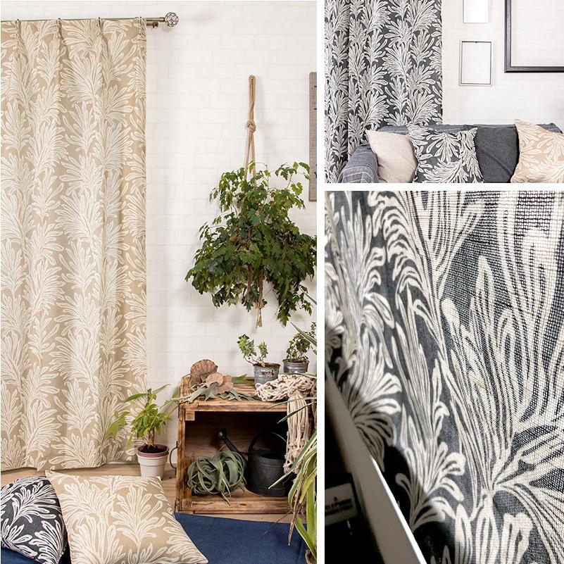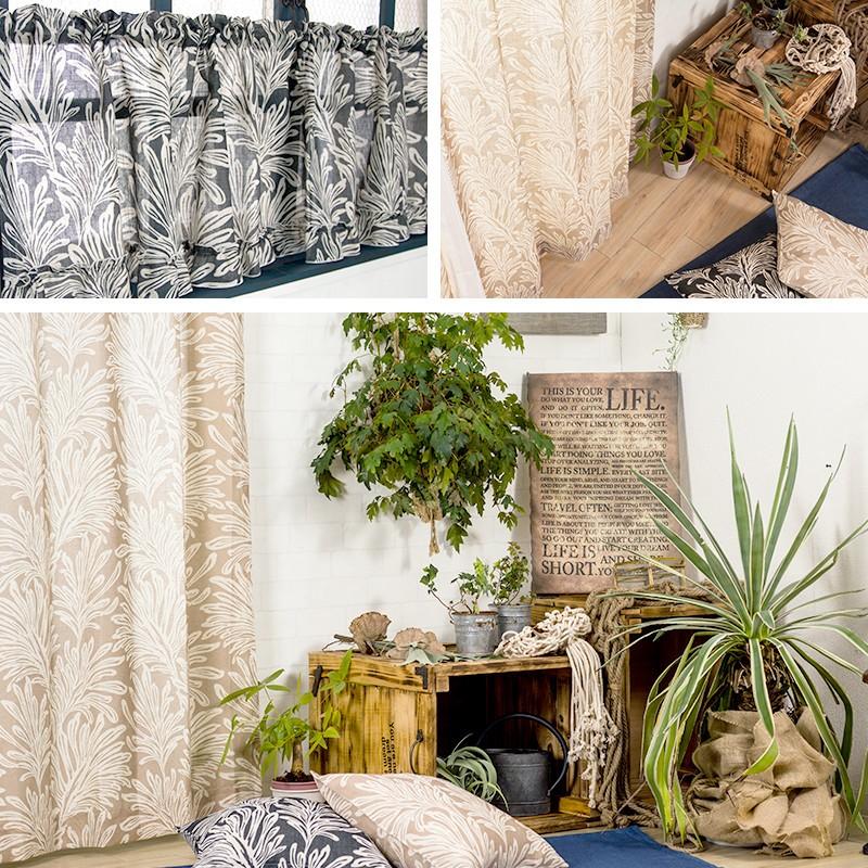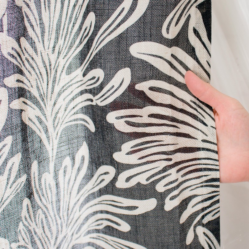 南国を思わせるヤシの葉のようなプリントデザインでブラックとベージュが大人のモノトーンなボタニカルインテリアをお楽しみいただけます。また、5%リネンが入っているのでハリのある生地感で厚地カーテンと合わせてレースカーテンとしてもお使いいただけます。