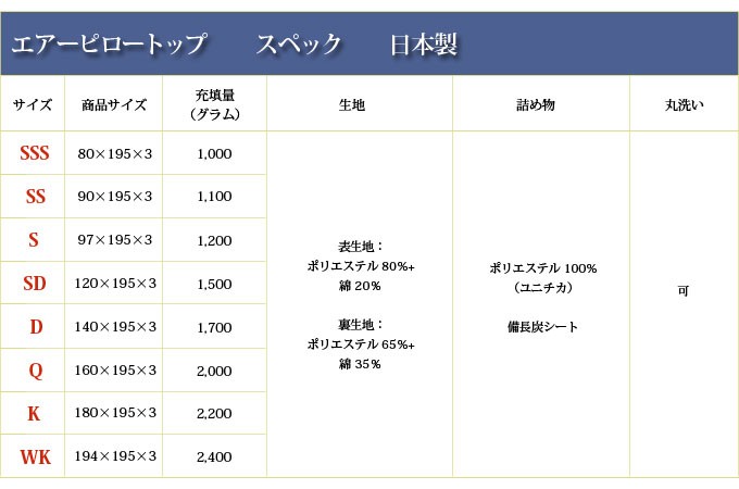 ■商品説明普段お使いのマットレスの表面に乗せるだけ高級ホテル仕様に!ピロートップをマットレスの表面に乗せることで高級ホテルの寝心地の象徴と言える「雲の上に浮かんでいる」ような感触をご堪能頂けます。ベッドパッドの目的はマットレスに汚れ等が付かないように保護する事が目的です。本商品のピロートップの目的は寝心地と機能を向上させる事が目的となります。高級ホテル仕様のマットレスでは身体へのフィット感と寝心地を向上させるためにピロートップ構造のマットレスを採用しています。こちらの商品は、ピロートップ構造を、今ご利用中のマットレスにプラスするだけでお楽しみ頂ける寝具となっております。■商品詳細生産地:日本サイズ:幅97×長さ195×厚み3cm【素材】表生地:ポリエステル80%+綿20%裏生地:ポリエステル65%+綿35%【 詰め物】ポリエステル100%(ユニチカ)備長炭シート"}