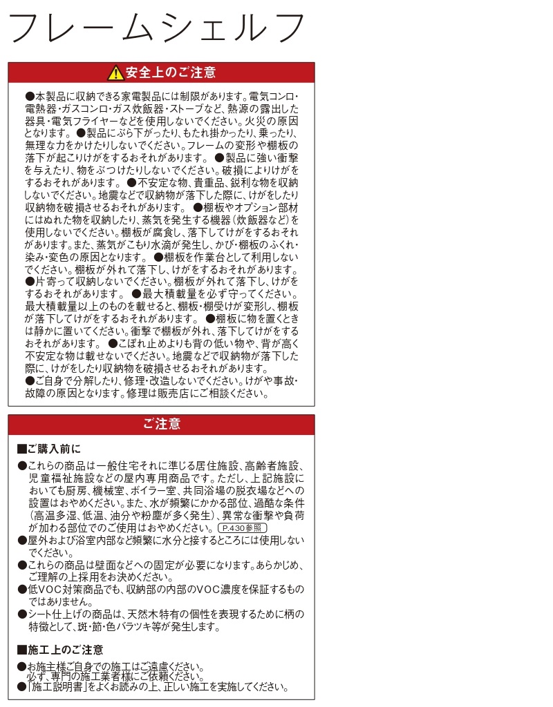 販売商品仕様☆パナソニック壁面収納フレームシェルフ 掲載商品以外の組み合わせ等については、お問い合わせください。 沖縄県については、お問い合わせください。☆複数のご注文はお問い合わせください 配送方法・配送形態について ☆メーカー直送便・西濃運輸・自社便でお届けいたします。配送便の指定はできません。 ☆商品は、車上渡しとなります。 (4トン車の横付け出来る場所でのお渡しです。)荷揚げ・開梱等はいたしません。 商品の交換・返品・キャンセルについて ☆商品は、ご注文確認後、メーカーへ発注いたします。 不具合品は、代替品を手配いたします。 発注後の、キャンセル・交換・返品はお受けいたしません。