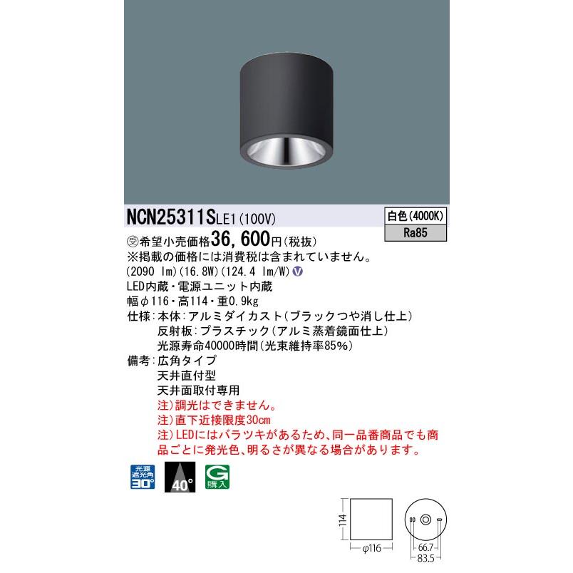 [法人限定] NCN25311S LE1 パナソニック スポットライト 天井直付 白色 小型シーリングライト ビーム角40度 広角タイプ 光源遮光角30度 [ NCN25311SLE1 ]