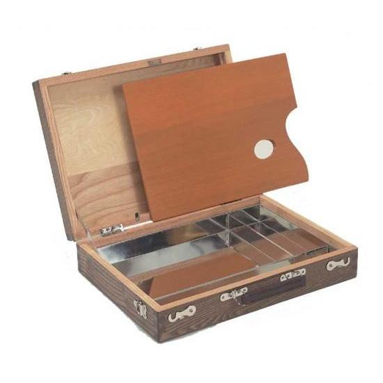 ●外寸サイズ(mm):W371×D271×H86 ブリキ外寸(mm):W342×D242×H35 絵具収納部(mm):W275×D201×H35 画用液納部(mm):W67×D201×H35 画筆収納部(mm):W342×D40×H35●材質:堅木材・ブリキ仕切●重量:2.1kg●角パレット付