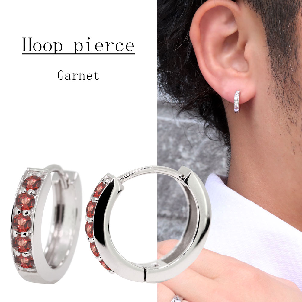 ピアス フープ シルバー メンズ 片耳 フープピアス 中折れ式 ガーネット 天然石