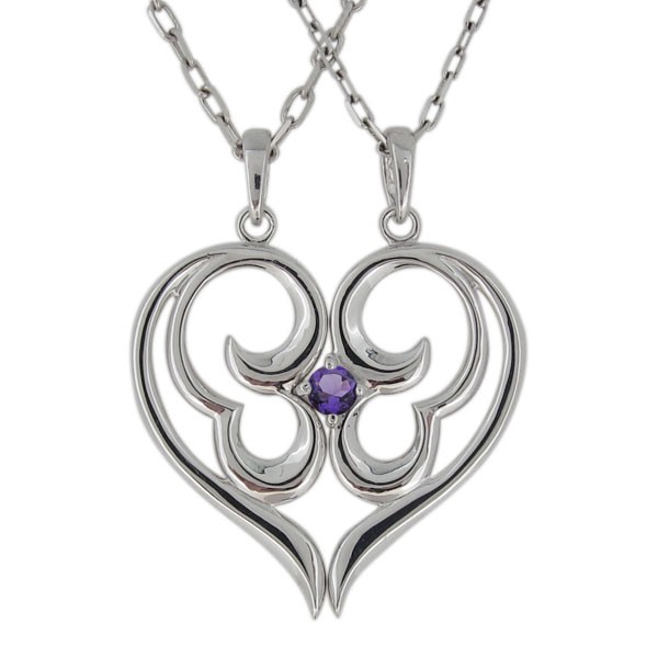 ![]() 2月誕生石アメジストを使用したシルバー製の、 ハートモチーフペアネックレス(ペンダント)です。 二人のトップを合わせるとハート型に シンプルで使いやすいトライバルデザインです。 ![]() ![]() 【地金カラー3色の中から】お選びいただけます