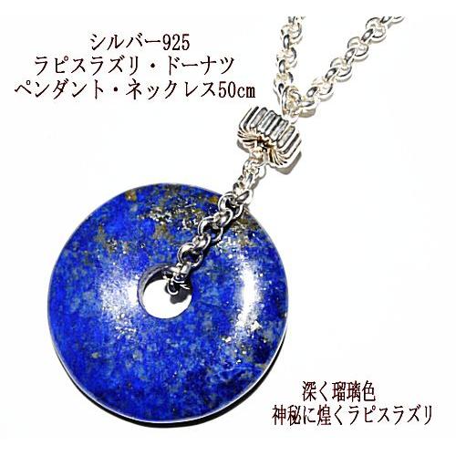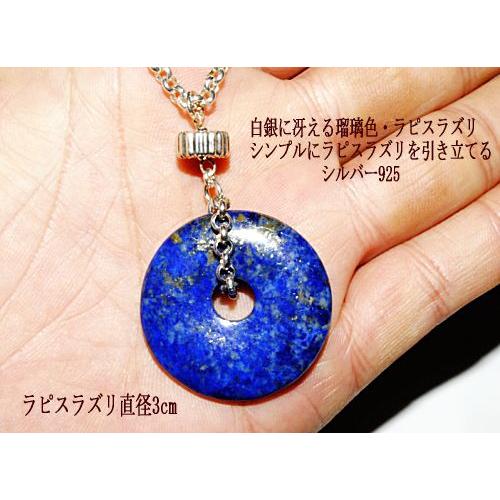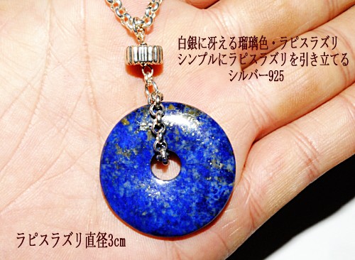 直径3cmのドーナツ型ラピスラズリが白銀に冴える存在感たっぷりのシルバー925/ラピスラズリ・アクセサリー神秘の石・ラピスラズリの魅了を最大限に引き出す為シンプルにかつ重厚感を出すシルバー925/ロロチェーンを使用。メンズの方にも、他のショートネックレスとの重ね着け、セーターの上からも着けられるようユニセックスな長めの50cm。"}