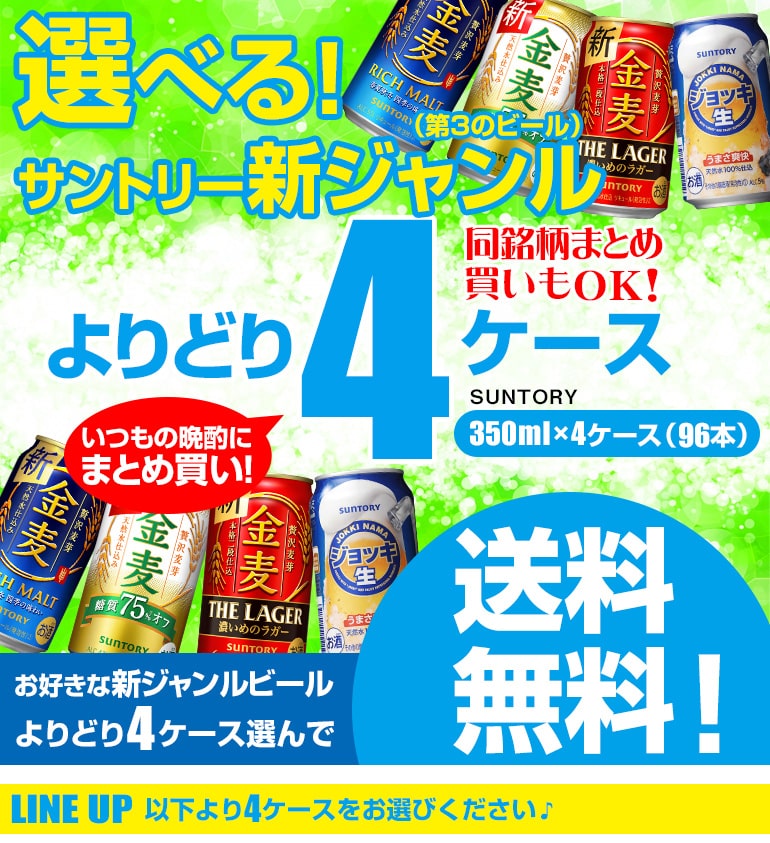 お好きなサントリー 新ジャンルビールよりどり4ケース金麦 糖質75%オフ 糖質オフ OFF 頂き から飲み比べ。好きなビールを4ケース詰め合わせ必ずご確認ください更新中のため、画像と選択可能商品が異なる場合があります。ご了承の程お願いします。他の商品との同梱はできません。他の商品とご一緒にご注文頂いた場合、複数口でのお届けとなりますので、表示される送料が異なります。ご注文後、送料を修正してメールにてご連絡させて頂きます。こちらの商品はケースを開封せず出荷をするため、納品書はお付けすることが出来ません。ご購入頂ける状態であっても商品が欠品となる場合がございます。おそれいりますが入荷までお待ち頂く場合がございますので、予めご了承下さい。季節限定商品はご購入いただける状態であっても完売となりご用意できない場合もございます。おそれいりますがご了承のほどよろしくお願い申し上げます。商品がリニューアル等により変更となる場合がございます。[御年賀][お年賀][年賀]クリスマス お年賀 御年賀 お正月