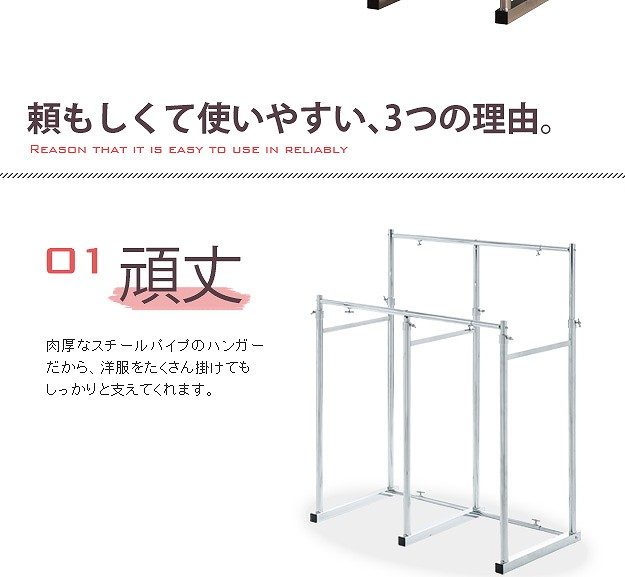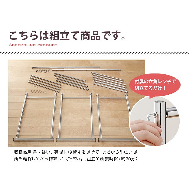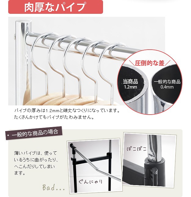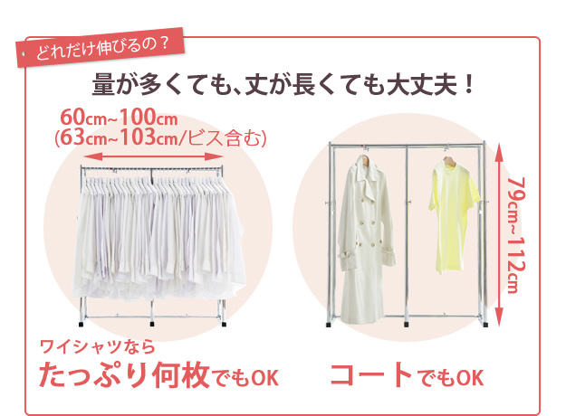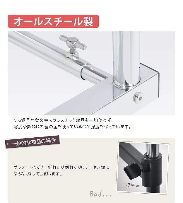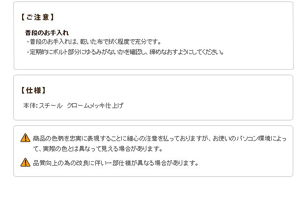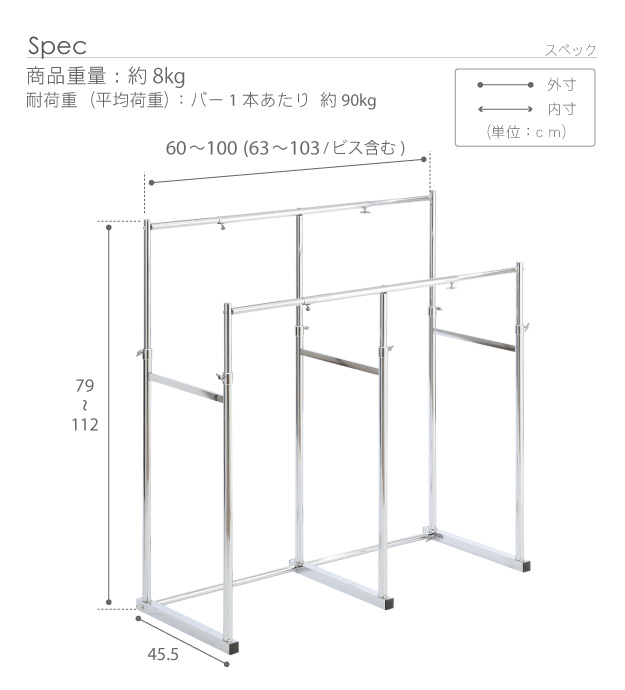 ※メーカー直送のためはお受けできません。※沖縄・一部離島は別途送料がかかります。お見積もりいたしますのでお問い合わせ下さい。【仕様】本体:スチール クロームメッキ仕上げ【サイズ】外寸(最小値):幅60(63/ビス含む)x奥行45.5x高さ79cm外寸(最大値):幅100(103/ビス含む)x奥行45.5x高さ112cm商品重量:約8kg耐荷重(平均荷重):バー1本あたり 約90kg株式会社ナカムラ(H0700034)"}