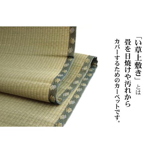 ★5000円以上で送料無料★JAN【4956642842941】上敷を敷くだけで畳のお部屋をリフレッシュできます。表と裏の両面が使用できるリバーシブルタイプでとっても経済的です。●サイズ:本間8畳(約382×382cm)。●画像は江戸間4.5畳のイメージです。【JANコード:4956642842941】●素材:い草 ※双目織 ヘリ=ポリプロピレン、ポリエチレン 長さ110?115cmの国産い草を使用しています。そのうち約95cmを使用しています。ヘリ際はある程度白みを帯びます。い草は先端と根元が白く真中が青(緑)色ですが、青色の部分を多く使用するほど、丈夫で綺麗で使用するうちに全体が綺麗に日焼けします。国産い草は一本一本が太く、表皮が厚く繊維がキメ細かいので弾力性があり、耐久性に優れています。い草には空気の清浄化作用、湿度の調節作用があり、汚れにくいといった特●その他のインテリア用品も多数取扱っております。