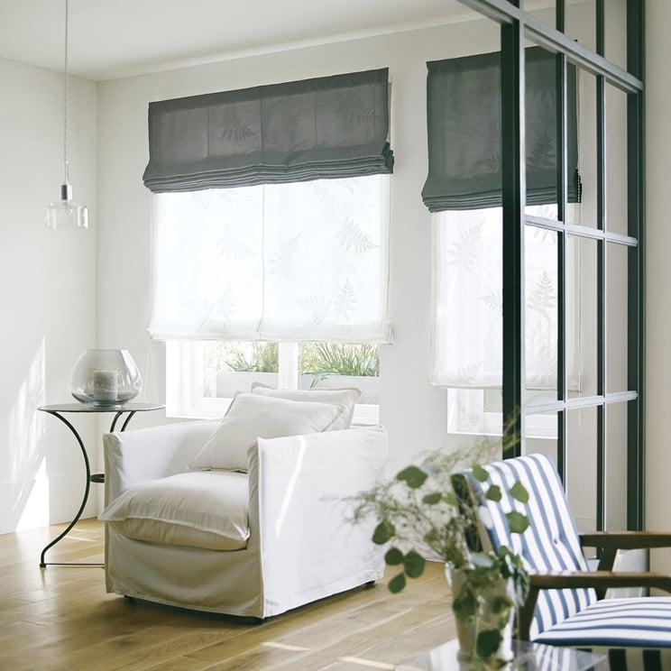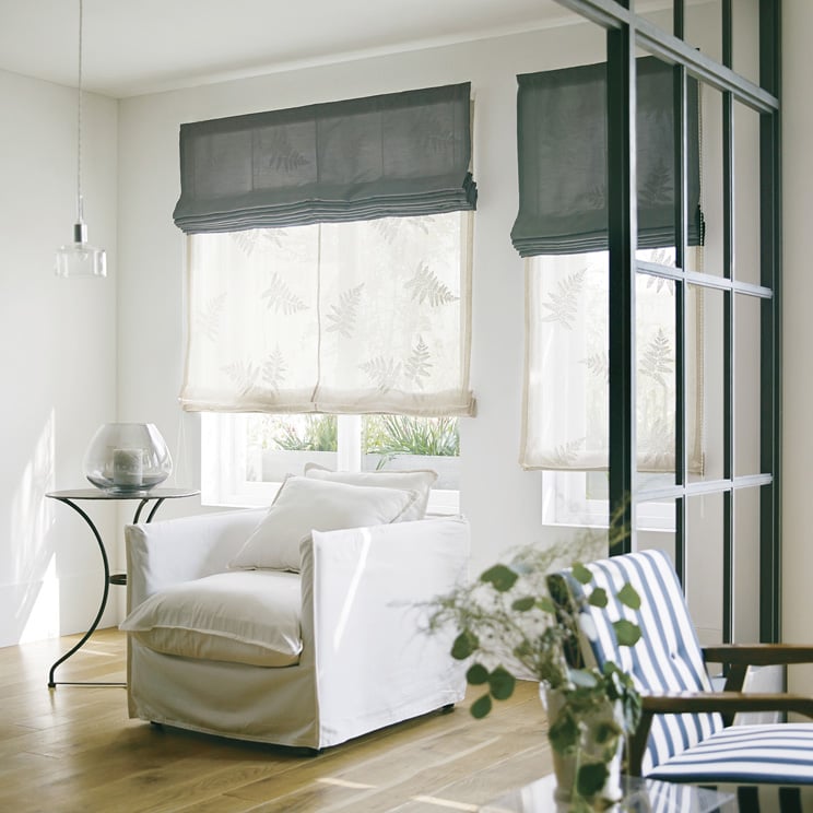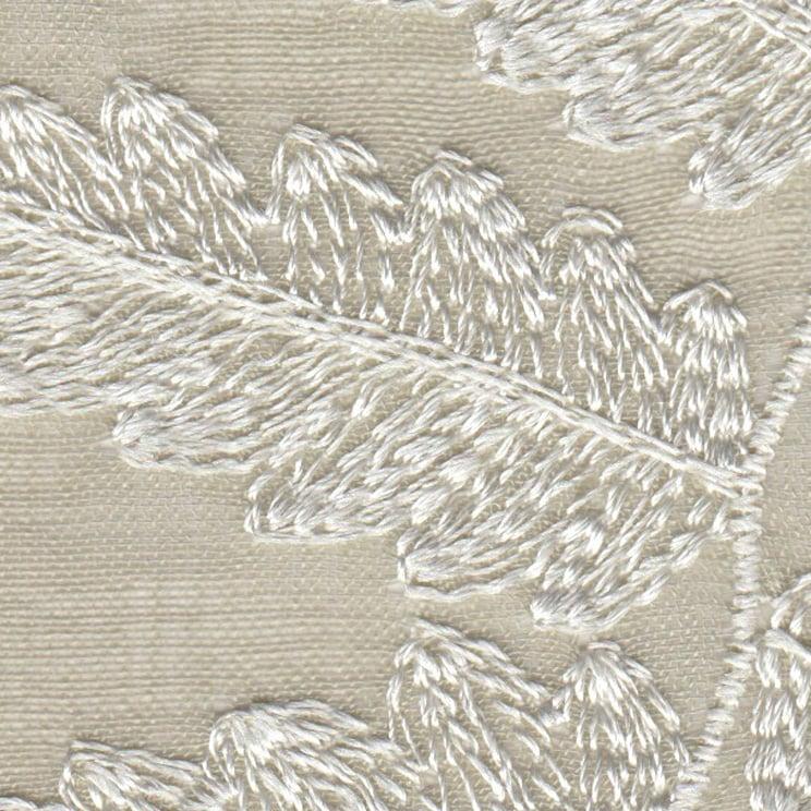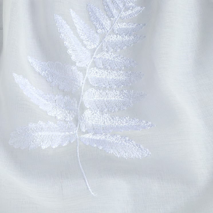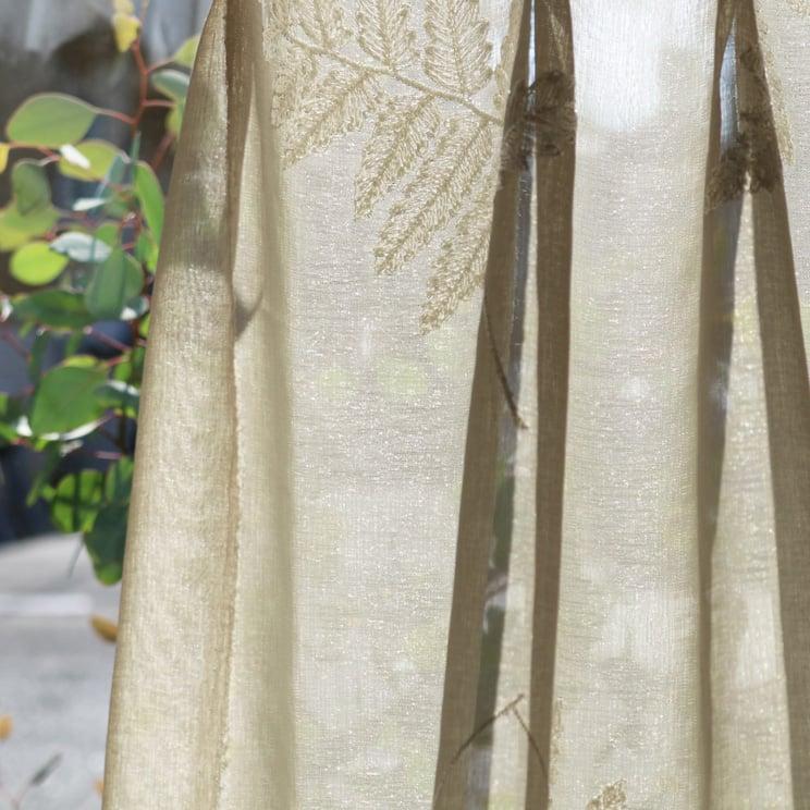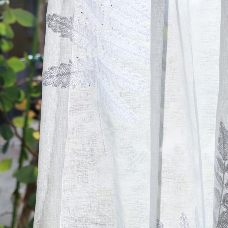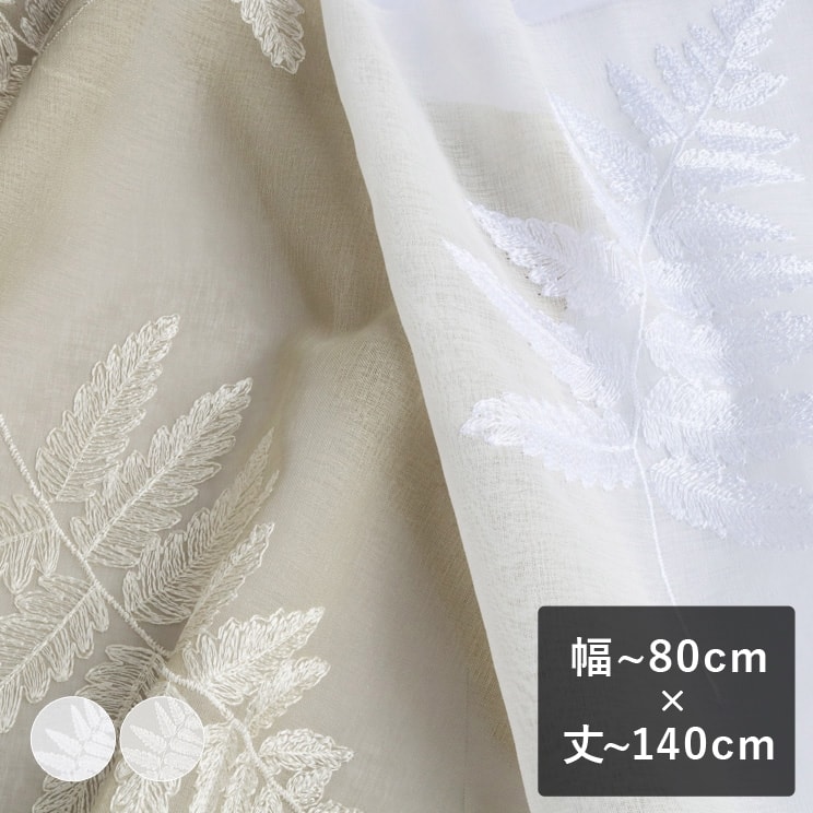 シダ植物をモチーフにした、刺繍のレースカーテンです。通常の2倍の太さの刺繍糸を贅沢に使い、葉の部分にボリュームを持たせています。立体的な刺繍がまるで葉脈に見え、生き生きとした表情を感じさせます。ベースはシャリっとした麻のような手触り。ナチュラルな雰囲気で、涼やかなテクスチャが楽しめます。"}