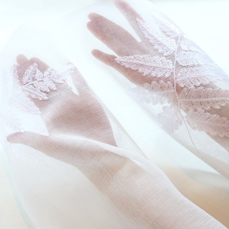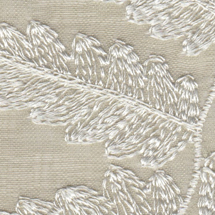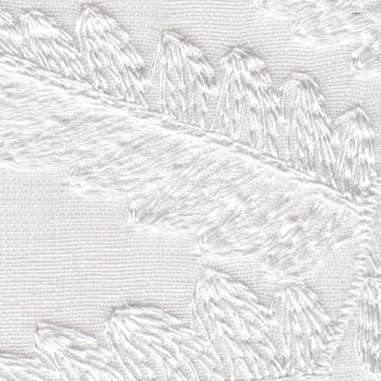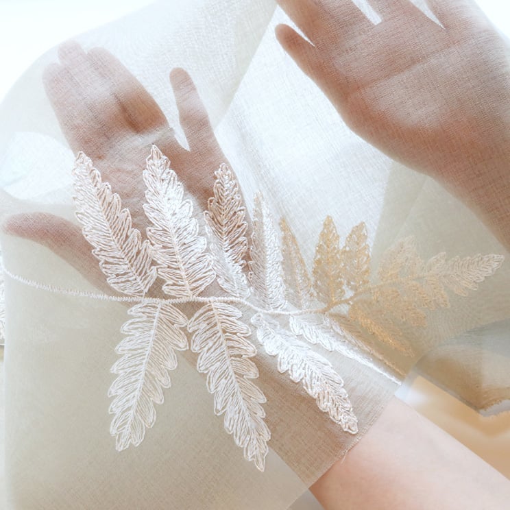 シダ植物をモチーフにした、刺繍のレースカーテンです。通常の2倍の太さの刺繍糸を贅沢に使い、葉の部分にボリュームを持たせています。