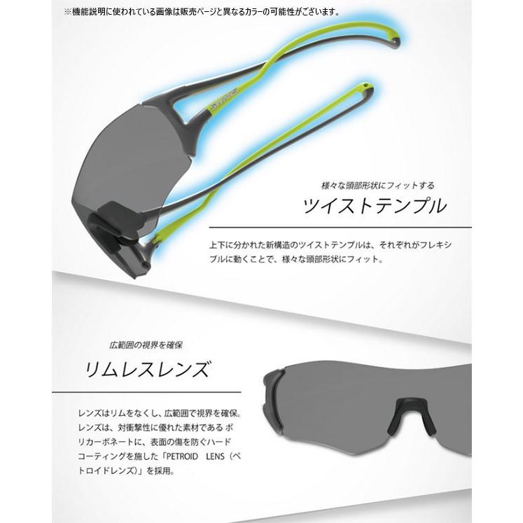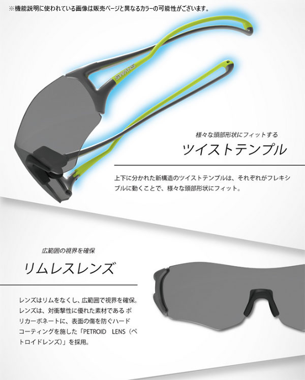 こちらの商品の素材、サイズ、機能など■様々な頭部形状にフィットするツイストテンプル:上下に分かれた新構造のツイストテンプルは、それぞれがフレキシブルに動くことで、様々な頭部形状にフィットすることができます。また、上下をひねり(ツイスト)ながら繋ぐことで、軽量性を保ちながら力強いホールド感を得ることができます。