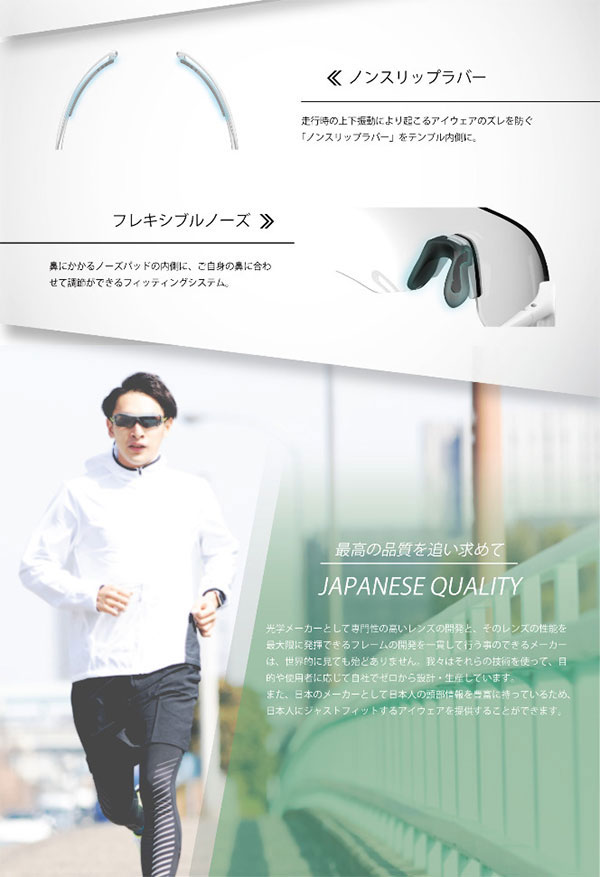 走行時の上下振動により起こるアイウェアのズレを防ぐ「ノンスリップラバー」を後頭部に当たるテンプルの内側に採用しました。