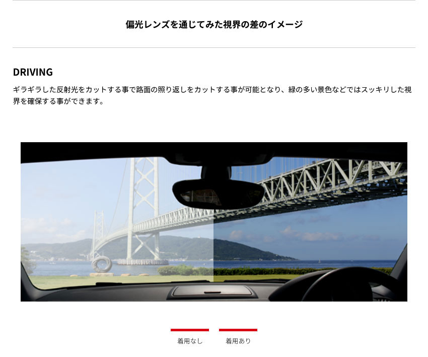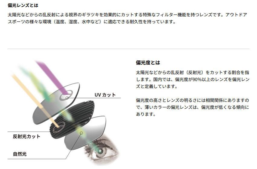 ベーシックなグレーカラーの偏光機能付レンズ。ドライブやフィッシングにも最適なカラーです。長時間の使用でも疲れにくいレンズです。