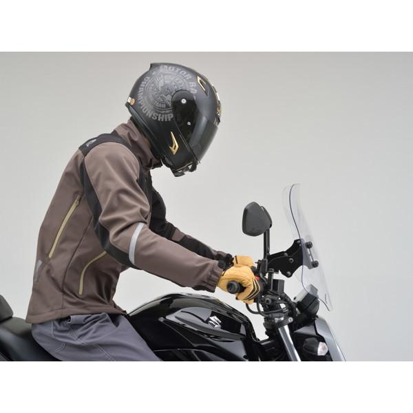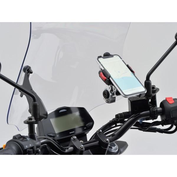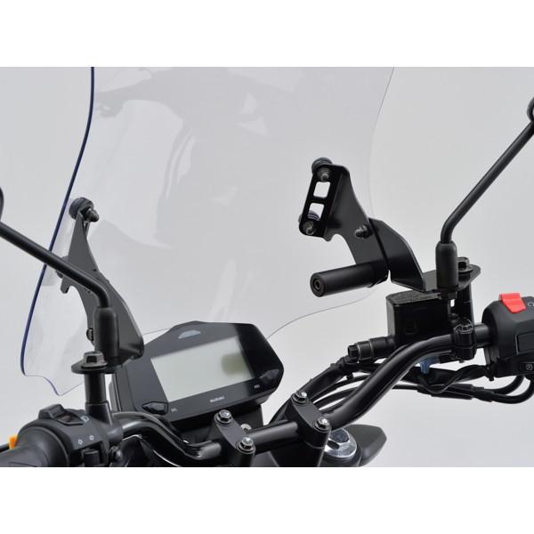 ウインドシールドの角度調整(約10度)が可能な車種専用の取付ステー付き。スマホやメーター等が装着可能なφ22.2のオプションバー付属。