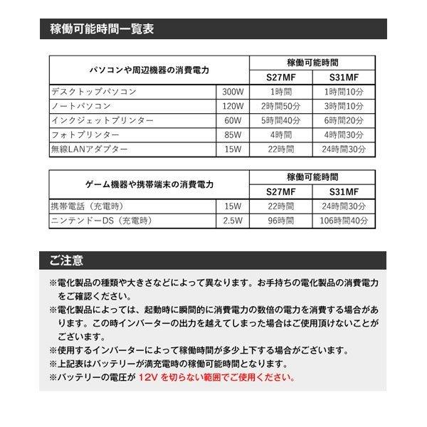 ■互換: M27MF SMF27MS-730 DC27MF など セミディープサイクルバッテリー■対応情報:マリンエンジン始動用 バスフィッシング用エレキ キャンピングカー 二次電源 他※対応情報は参考情報です。搭載中のバッテリーを確認せずにご購入された場合、一切の責任を負いかねます。■外形寸法(mm)長さ:303、奥行:172、高さ:200 総高:221■端子:ツインターミナル (インチねじ 規格5/16(外径約7.9mm)、山数18)■電圧(V):12 ■20HR容量(Ah):90■CCA:750 ■R.C(リザーブキャパシティー)(min):160■販売店保証6ヶ月■同梱物・本体・ナット・蝶ネジ・排ガスチューブ・説明書■バッテリーの長寿命・性能アップに効果的な、初期補充電済み。