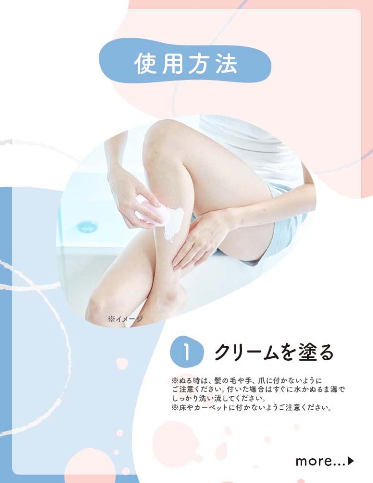 ●水に流れにくい成分配合で、クリームに水がかかってもクリームが肌に残り除毛効果が続く。