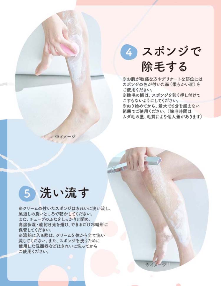 ・除毛後の肌には、石けんなどは使用しないでください。また、ボディタオルなどでこすらないようにしてください。