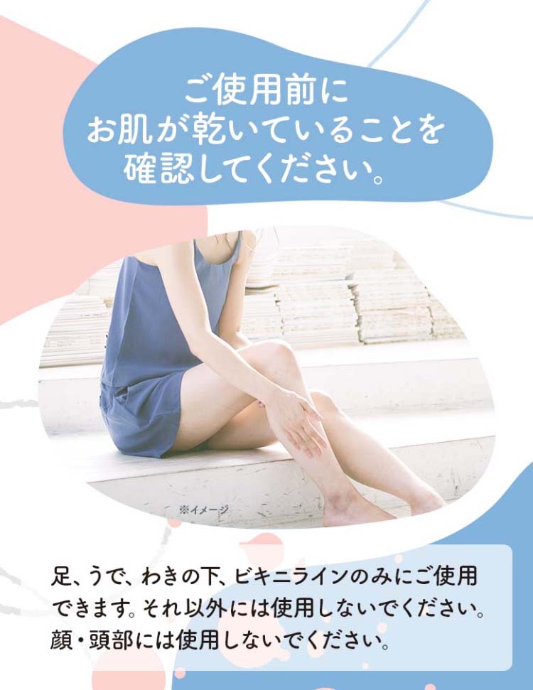 ・足、うで、わきの下、ビキニラインのみにご使用できます。それ以外には使用しないでください。