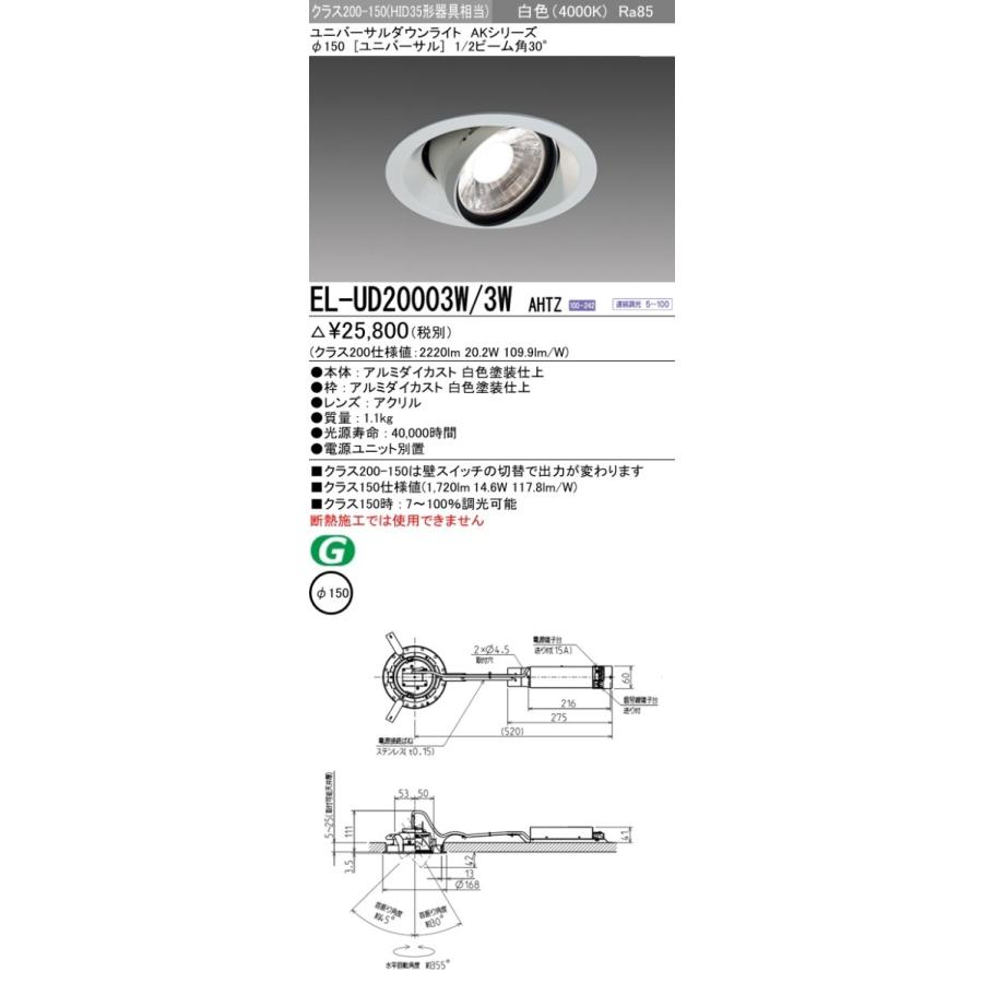 LEDダウンライト 集光シリーズ ユニバーサル 白色(4000K) 埋込穴:φ150 (クラス200) EL-UD20003W/3W AHTZ