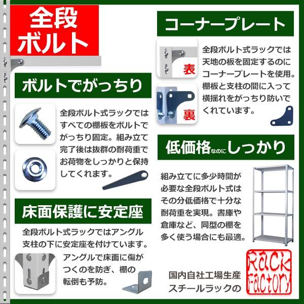 ◇ラック・ファクトリーならではの国内自社工場生産品・Rack Factoryでは全品自社国内工場生産。直販だから在庫切れの心配なし。◇安価でしっかり。棚板追加も自在の全段ボルトタイプ・L字型のアングルに棚板を設置するオーソドックスなスチールラックです。・天地をはじめ、中間棚板も全てボルトで固定する方式のため、安価ながら 抜群の耐荷重性能を発揮。安価安心の堅牢性でご愛用いただける商品です。◇お届けやご注文に関するご注意 ※必ずお読み下さい・大型配送物のため、4t車の場合、運送へ支店引取をお願いする場合があります。・お届け先、お荷物の重量によって配送業者が変わります。(業者の指定はできません)・重量物につき、原則建物一階での軒先渡しのみとなります。搬入・設置は行えません。・商業施設の店舗宛ての場合には、搬入が必要になるため配達できない場合があります。・日曜日・祝日の配送は出来ません。時間指定はAM・PM納期の明記のみとなります。・大型配達物のため、北海道・沖縄・離島・一部過疎地の配達には対応しておりません。