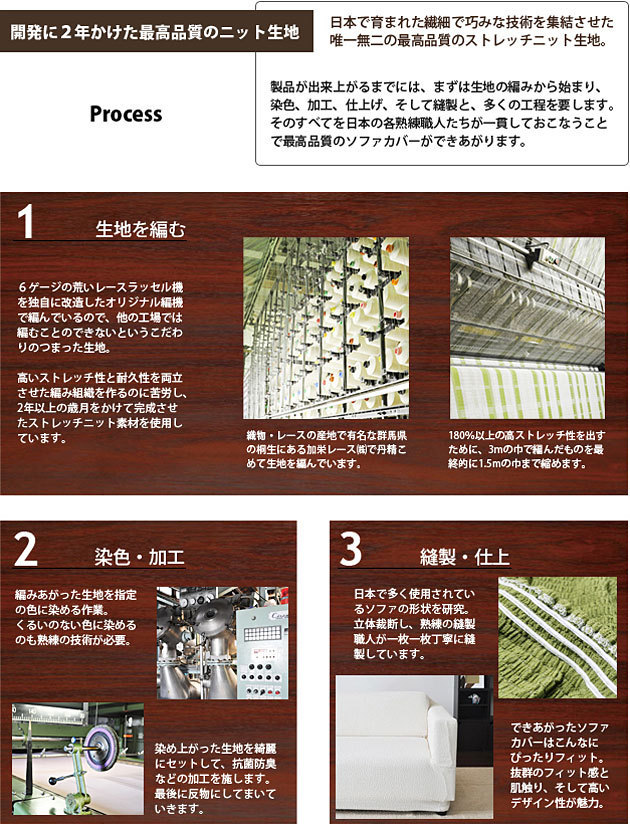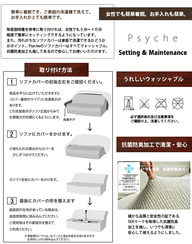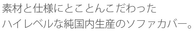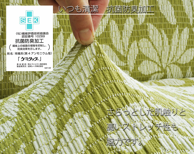 ![]() | ![]() ☆さらっとしたナチュラルな肌触り 綿の混率をアップすることで、他にはないさらっとした気持ちのいい肌触りを実現しました。オールシーズンでお使いいただけます。 ☆計算されたフィット感 絶妙なストレッチ性を備えた生地だけでなく、ソファの下部分にあたる裾部分には3本のゴムをあしらっており、ダラっとせずすっきりとした足回りになるよう工夫しています。 ☆抗菌防臭加工 「SEK」マーク取得の抗菌防臭加工を施してあり、いつでも清潔安心にソファでくつろげます。 ☆手軽に簡単装着! 女性でも簡単に装着できる手軽さも魅力。取り外しが簡単なので、コマ目に洗濯などもできますね! |