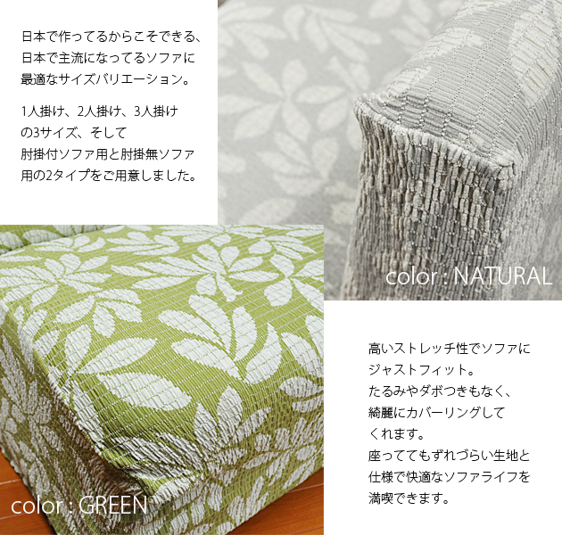 | 【肘掛無しソファ用】 フィット式ストレッチソファカバー<ローリエ柄> 【Psyche-Laurier プシュケ-ローリエ】 <2カラー・3サイズ> </h2> お気に入りの大切なソファを清潔に長く愛用したいというたくさんのご要望から生まれた「ソファカバー」。 いろいろな種類が販売されていますが、当店がこだわったのは「素材」「フィット感」「機能性」「クオリティ」。 綿の混率を大幅にアップさせ、さらっとした気持ちいい肌触りと計算されたストレッチ仕様による絶妙なフィット感を実現、そこに抗菌防臭加工を施し、すべて国内生産で仕上げたワンランク上のソファカバーです★ ご要望の多かった柄物がついに登場! 快適なソファライフを満喫できるオススメのアイテム! |