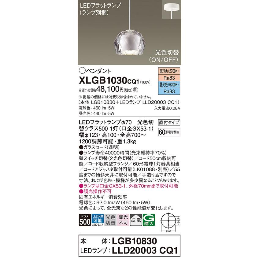 パナソニック XLGB1030CQ1 ペンダントライト 吊下型 LED(昼光色・電球色) ガラスセードタイプ・拡散タイプ・直付タイプ 光色切替(ON/OFF) 透明