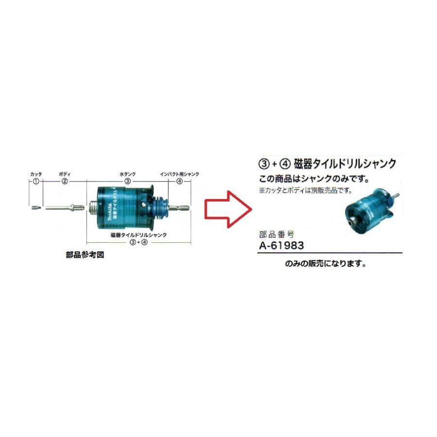 マキタ 磁器タイルドリル用 部品部品の販売になります。画像番号(3) と(4)の部分になります。(3水タンクと4インパクト用シャンク)部品番号:A-61983"}
