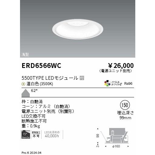施設用照明器具 遠藤照明 ダウンライト ERD6566WC 検索用カテゴリ361 【LED照明】 【DL埋込穴150】 【温白色】 【超広角タイプ】本体のみ、電源ユニット別売