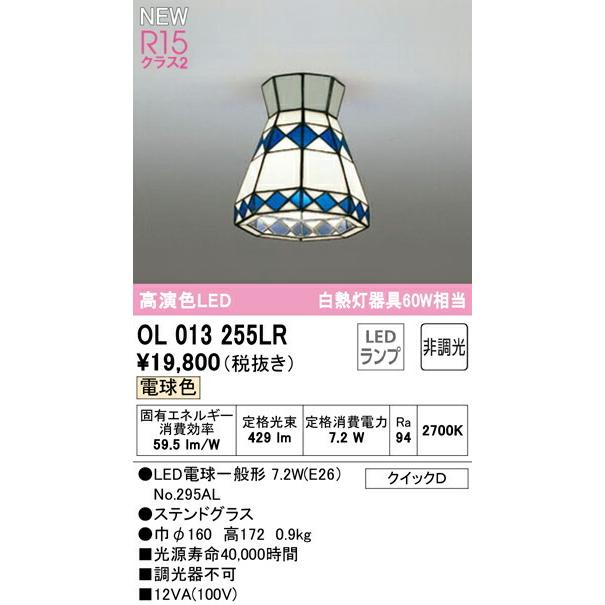 【決済・後払い決済】 高演色LED 白熱灯器具60W相当 OL013255LR 電球色 消費電力7.2W Ra94 ●LED電球一般形 7.2W(E26) No.295AL ●テンドグラス ●巾φ160 高172 0.9kg ■光源寿命40,000時間 ■調光器 クイックD その他メーカーへのお問い合わせはコチラ →