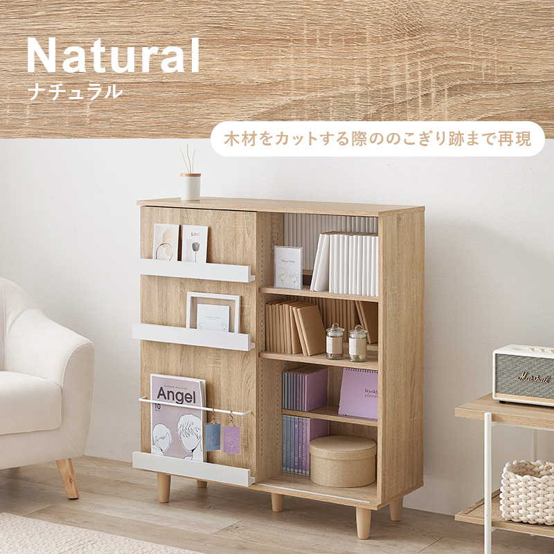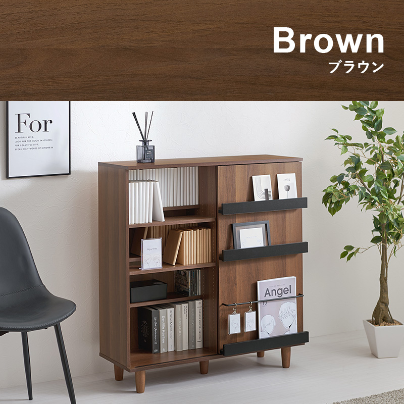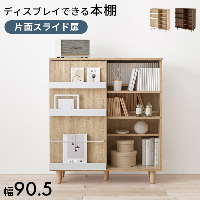 片面スライド扉付ブックシェルフ。前後分割棚板仕様で、たっぷり収納でき、扉前板には雑誌やカードなどのディスプレイも可能です。■サイズ:(約)幅90.5×奥行37×高さ101.5cm■素材:主材:プリント紙化粧パーティクルボード■カラー:ナチュラル/ブラウン■生産地:ベトナム製■その他:・組立式・2分割可動棚16枚
