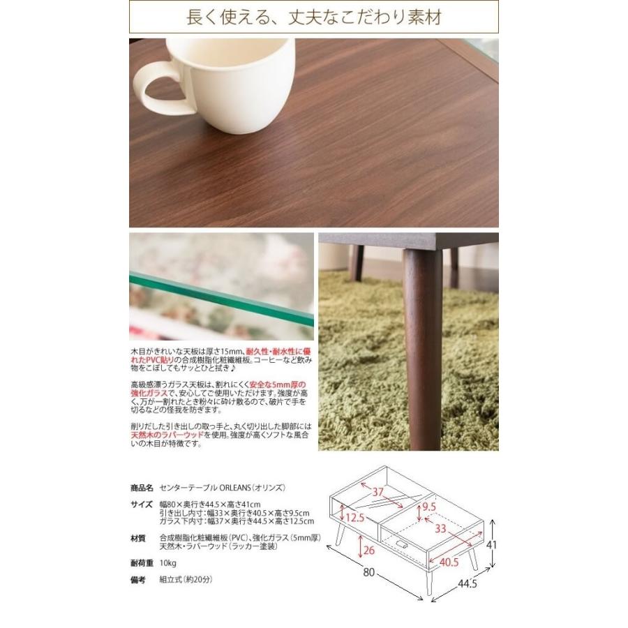 商品発送元:おしゃれな家具やインテリア収納 ガンモマーケット生活・インテリア・文具、テーブル、センターテーブルリビングにある魅せたいもの、隠したいものの両方が収納できる便利なセンターテーブル。半分がキレイなガラス天板+お気に入りの雑貨を魅せる収納スペース、もう半分は木製天板+引き出しとなっております。■組立式(約20分)商品詳細サイズ:幅80×奥行き44.5×高さ41cm引き出し内寸:幅33×奥行き40.5×高さ9.5cmガラス下内寸:幅37×奥行き44.5×高さ12.5cm素材:合成樹脂化粧繊維板(PVC)強化ガラス(5mm厚)天然木・ラバーウッド(ラッカー塗装)耐荷重:10kgメーカー希望小売価格:オープンプライス■この商品は送料無料です(※ただし北海道・沖縄・離島は別途送料お見積します。ご注文前にお問い合わせ下さい。)"} 商品説明 リビングにある魅せたいもの、