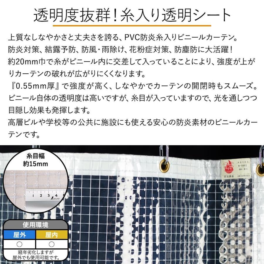 ビニールカーテン 透明 屋外 雨除け ベランダ 断熱 防炎 糸入り サイズオーダー 暖房 空調 効率UP 省エネ 〈0.55mm厚〉 【FT07】■カーテンサイズ:オーダーサイズ■厚み:約0.55mm 糸部約0.66mm■糸目幅:約15mm■重量:約720g/m2■機能:防炎■カラー:無色透明■摘要:日本製■注意事項・ビニール製の為、仕上りサイズから1〜2%の誤差がでる場合があります。ご了承ください。・サイズが大きくなると縦方向に幅継が入ります。幅継の箇所や間隔が気になる方は事前にお問い合わせください。・完全オーダー商品のため、ご注文後のキャンセル・返品・交換は対応できませんのでご了承ください。・色、質感等は、サンプル請求で事前にお確かめください。ビニールシート 透明シート 糸入り 冷房 空調 効率UP 省エネ 紫外線カット 薄手 屋外 業務用 工場 店舗 間仕切 大型 施工 見積り 大阪 防雪 防風 雨除け eco 省エネ 喫煙所 喫煙室 分煙 分煙化 受動喫煙対策 喫煙ブース 安いコロナ対策 ビニールフィルム 飛沫対策 飛沫防止 感染防止▼ 詳しくは商品説明内の詳細をご確認下さい ▼▼ その他サイズは商品説明内をご確認ください ▼