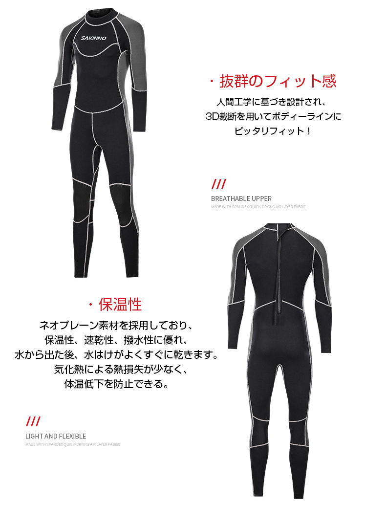 ウェットスーツ フルスーツ 3mmネオプレーン メンズ ストレッチ 保護 ダイビング サーフィン 防寒 保温 マリンスポーツ シュノーケリング MS120【アイテム詳細】川・海・プールでの怪我防止やUVカットなど、もっと気軽にもっと簡単に最高のフルスーツを楽しめる!体にフィットする3D立体裁断で、激しいライディングでのストレスを軽減。海水の侵入を極限まで防ぎ、生地や縫製など細部にまでこだわりました。ダイビング、シュノーケル、サーフィン、カヤック、サップフィッシング、パドリング、ジェットスキー、海上作業などに幅広く適用できます。【型番号】MS-120【カラー】グレー【サイズ】S、M、L、XL、2XL、3XL【厚さ】 3mm【材質】ストレッチネオプレーン、ナイロン【保管について】海から上がったら、なるべく早めに洗う。熱いお湯はNG、必ず水かぬるま湯で洗う。乾燥は直射日光を避け、細いハンガーは使用しない。しっかりと乾燥したら、なるべく早めに表面へ