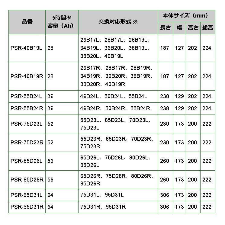 国産車高性能カルシウムバッテリー メーカー品番 : PSR-75D23L ハクライ品番 : PSR-75D23L |