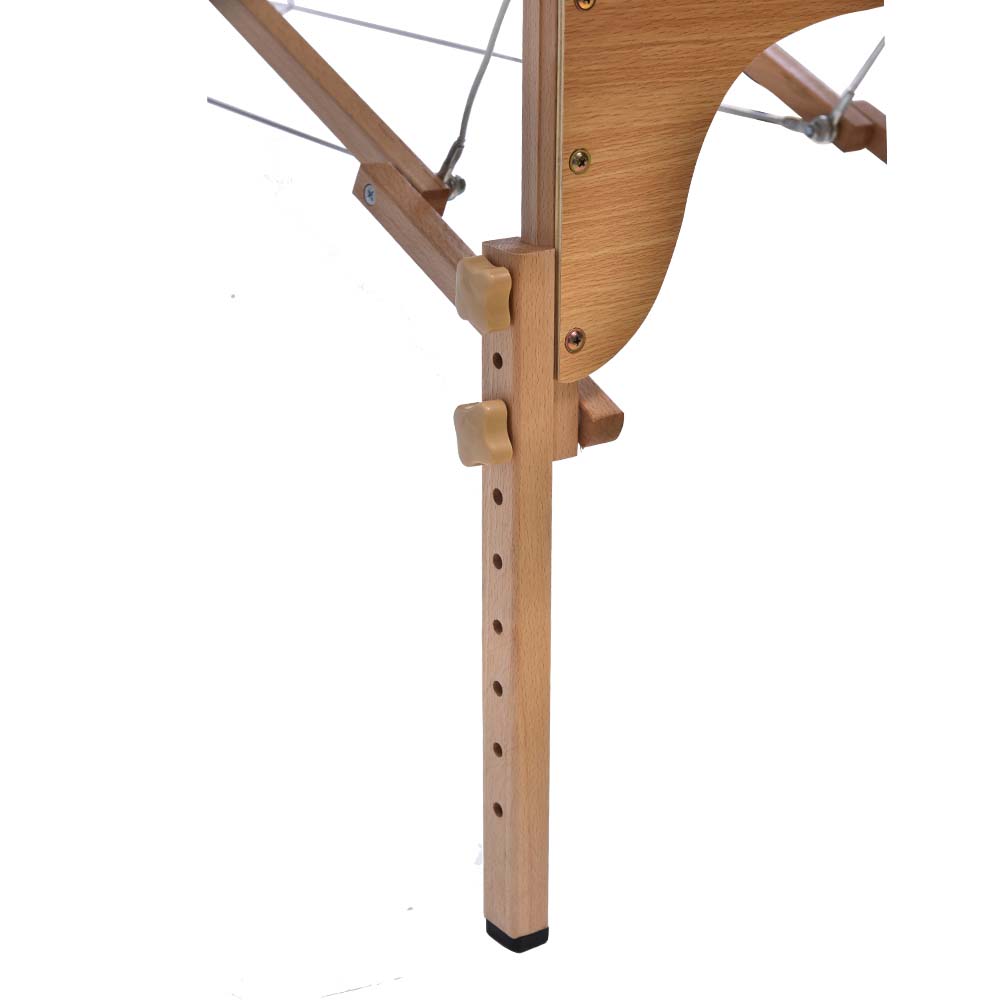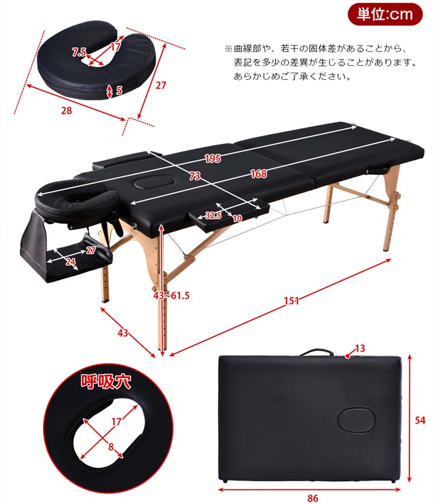 折りたたみができて持ち運び簡単 重さは13kgだから、女性でも楽に持ち運べます。折りたたむと軽自動車にも積み込みができます。50秒ぐらいで組み立てられる この折りたたみベッドは、50秒足らずに折りたたむ状態から組み立てられます。7段階の調節が可能 高さ43cm〜61.5cm、最大幅195cm、施術をなさる方の身長に合わせることができて、無理のない最も力が伝わりやすい体勢で施術できるようになります。アームレスト付き、楽な姿勢でリラックスできる 優しい触感のウレタン入り腕置きで、肩回りの力を抜き、腕も心地よく休められます。首を圧迫しない 首の部分は角度調節可能なので、お客様の一番楽な姿勢をご提供できます。"}