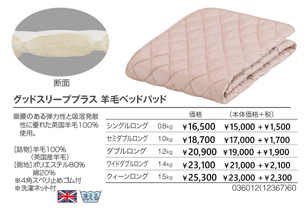 フランスベッド グッドスリーププラス 羊毛ベッドパッドクイーンロングサイズ(170×205cm)通常価格25,300円(税込) 中国製腰のある弾力性と吸湿発散性にすぐれた英国羊毛100%使用。通常の厚さの、ベッドパッドになります。・側生地 ポリエステル80%、綿20% ベージュ色※ロットにより若干、生地色が異なることがございます。・詰め物 イギリス産羊毛 100% 1.5kg・サイズ170×205cm・4角にズレ防止ゴム付(マットレス厚30cm程度まで)・お洗濯可能です。洗濯ネット付。 ドライクリーニングも可能です。・フランスベッドの定番ベッドパッドです。 扱いやすく、使いやすいウォッシャブル羊毛ベッドパッドです。 標準的な硬さのマットレスから、硬めのマットレスまで、 フィットします。 ※メーカーからのおまけで、洗濯ネットが付いています。 ただし、サイズ的にベッドパッドには不向きですので、 シーツ等のお洗濯にご使用ください。※社内コード 36012-760