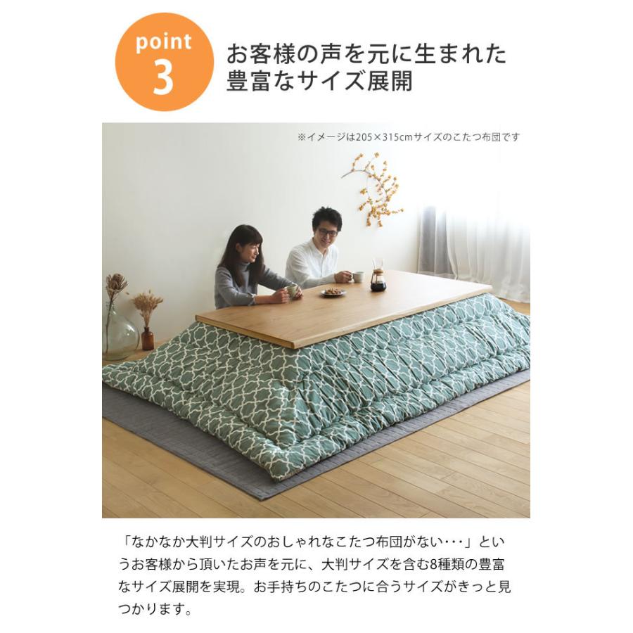 「なかなか大判サイズのおしゃれなこたつ布団がない・・・」というお客様から頂いたお声を元に、大判サイズを含む8種類の豊富なサイズ展開を実現。
