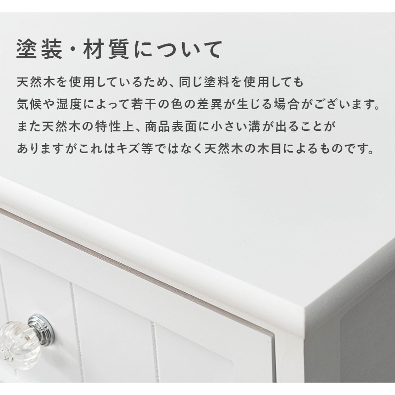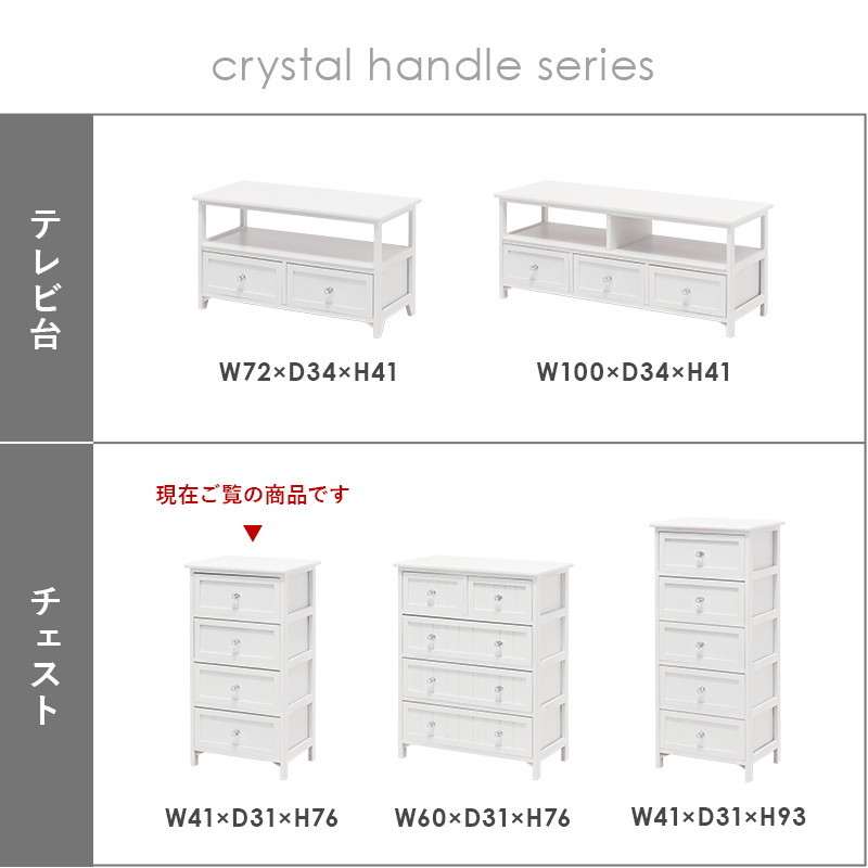 ■商品説明使いまわしの良いホワイトチェスト。●コロンと可愛いフォルムと透明感のあるクリスタル調の取っ手がアクセント。●テレビ台・チェストのシリーズでコーディネートが可能です。●主材に軽い桐材を使用しているので、女性でも簡単に持ち運びができます。●お掃除や模様替えも楽なので1人暮らしにもおすすめの家具です。●引き出し収納には細々とした小物や衣類などの収納に便利です。●取っ手をつけるだけのほぼ完成品なので届いてすぐにお使いいただけます。■商品詳細サイズ:(約)幅41×奥行31×高さ76cm引き出し内寸:(約)幅32.5×奥行24×深さ13.5cm重量:約5kg素材:主材:桐材、MDF"}