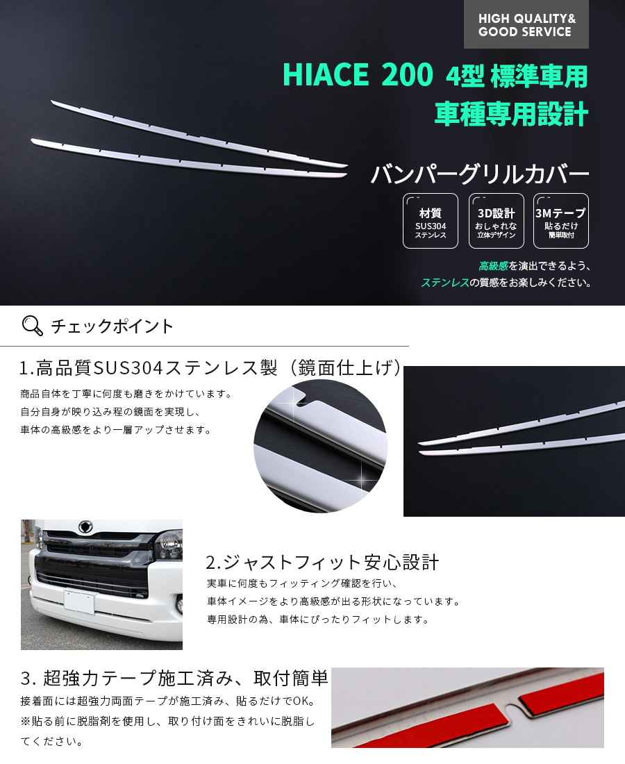 適合車種:ハイエース/レジアスエース200系(KDH200/TRH200系) 標準 4型年式:H25.12〜※DX/スーパーGL/レジアスエース5型対応パノラミックビューモニター付き車非対応■商品内容ピース数:2PCS 材質:SUS304ステンレス(鏡面仕上げ)ガーニッシュ色:シルバー(具体的なカラー・形状は画像にてご確認ください)品番:EX423■商品特徴高品質なステンレス素材で変形などする事もなく長期に渡って使用可能です。 顔が映り込むほどの鏡面仕上げでフロントビューをより上質にドレスアップいただけます。製作に当たり実車にて幾度もフィッティング確認を行い仕上げた専用設計モデルになります。 超強力両面テープ装着済み、貼るだけの簡単な取り付け!■取付方法1、取り付け前に仮合わせし、必ずフィッティング確認をしてください。2、貼り付ける際は、接着面に油分や汚れを十分に落として施工してください。後で強力両面テープで貼るだけの簡単取付です。■キーワードハイエース/レジアスエース 200系 4型(標準車) フロント バンパーグリルカバー グリルトリム ガーニッシュ エアロ ステンレス製 外装 カスタムパーツ EX423