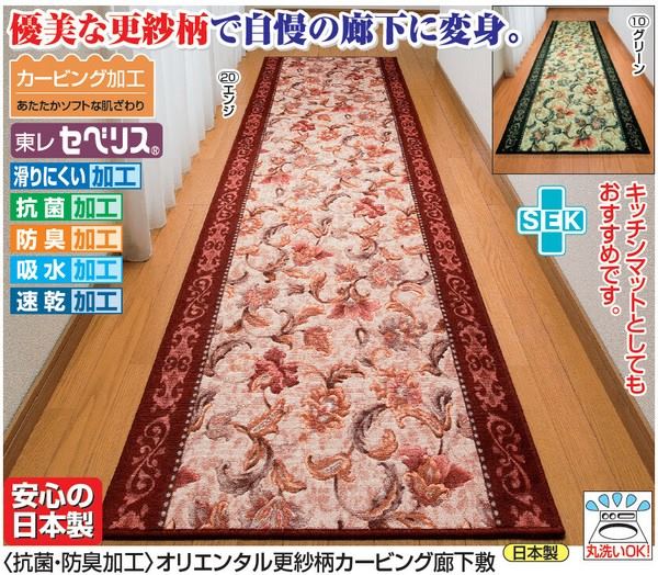 優美な更紗柄で自慢の廊下に変身。キッチンマットとしてもおすすめです。カービング加工、あたたかソフトな肌ざわり東レ セベリス(R)滑りにくい加工、抗菌加工、防臭加工、吸水加工、速乾加工安心の日本製丸洗いOK!パイル長さ:約6mm※商品によって色・柄・サイズ等が多少異なる場合がございます。商品名:抗菌・防臭加工 オリエンタル更紗柄カービング廊下敷 80×240cmカラー:グリーン/エンジ(80×240cm):サイズ:(約)80×240cm重さ:(約)2.2kg素材/表面:アクリル100%(東レ セベリス(R))、裏面:滑りにくい加工日本製■送料:全国一律900円(北海道は1200円)※沖縄・離島はお届けができません。※日時指定はお受けできません。予めご了承くださいませ。4304510 4304520 FL-2894 防臭 吸水 速乾 丸洗い"}