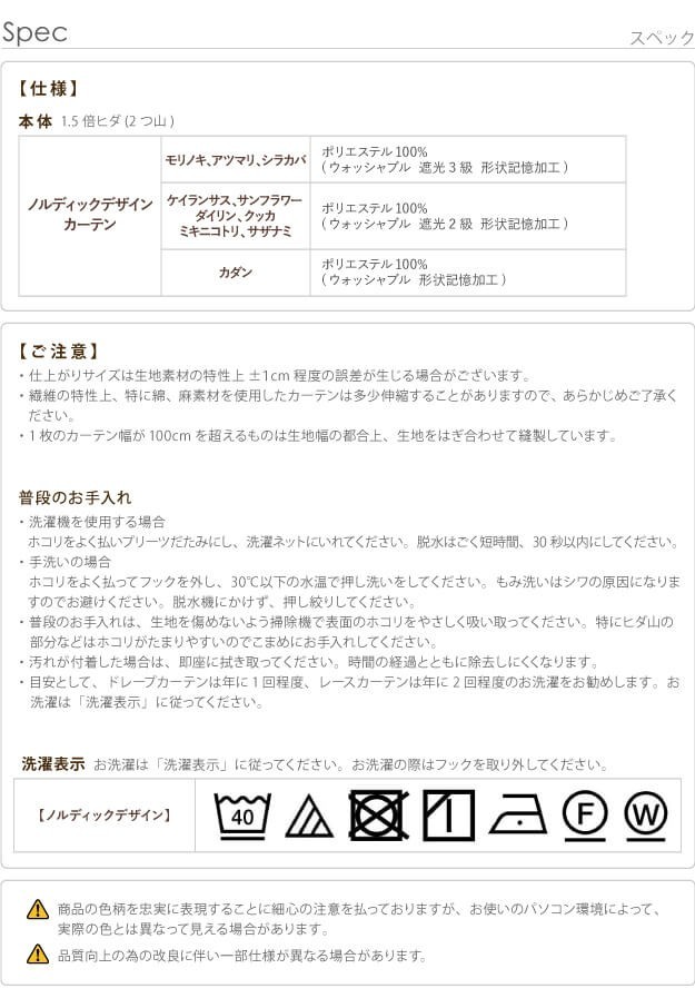【仕様】ポリエステル100%形状記憶加工(ウォッシャブル)遮光3級:モリノキ、アツマリ、シラカバ遮光2級:ケイランサス、サンフラワー、ダイリン、クッカ、ミキニコトリ、サザナミ【サイズ】[幅200cm]丈135cm/ 重量:約1kg丈150cm〜178cm/ 重量:約1.5kg丈185cm〜220cm/ 重量:約2kg丈225cm〜230cm/ 重量:約2.5kg丈235cm〜260cm/ 重量:約3kg株式会社ナカムラ(33100937)"}
